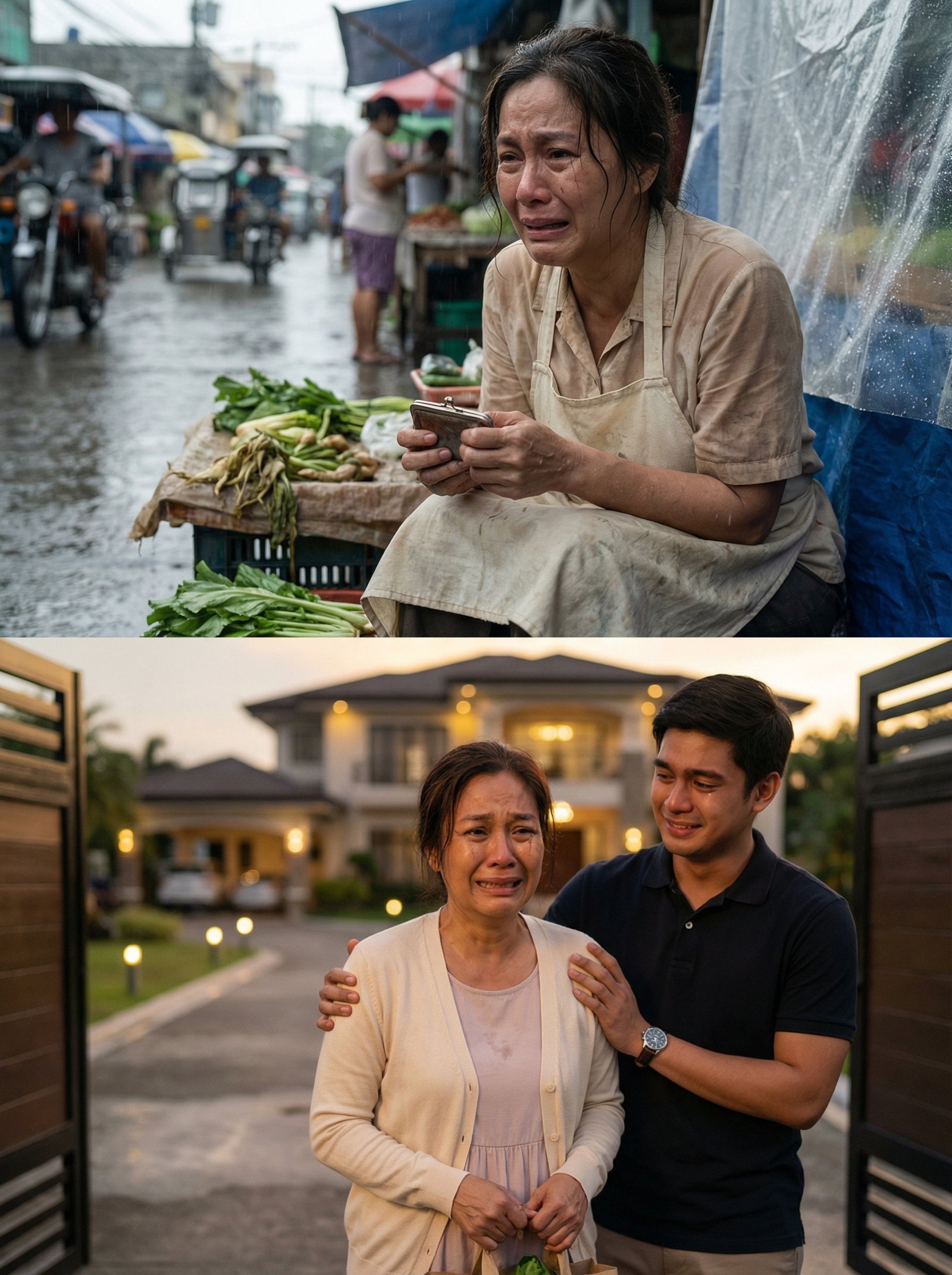 Pagsapit ng hapon, ang ulan ay humina. Ang langit ay naging kulay abo na may bahid ng gintong liwanag. At doon, sa harap ng isang malaking gate—malinis na driveway, maayos na ilaw sa gilid, at isang bahay na parang pangarap—nakita ang babae na muli na namang umiiyak. Ngunit iba ang luha ngayon. Hindi na ito luha ng pagod sa palengke. Ito ay luha ng takot na hindi siya bagay sa bagong mundo.