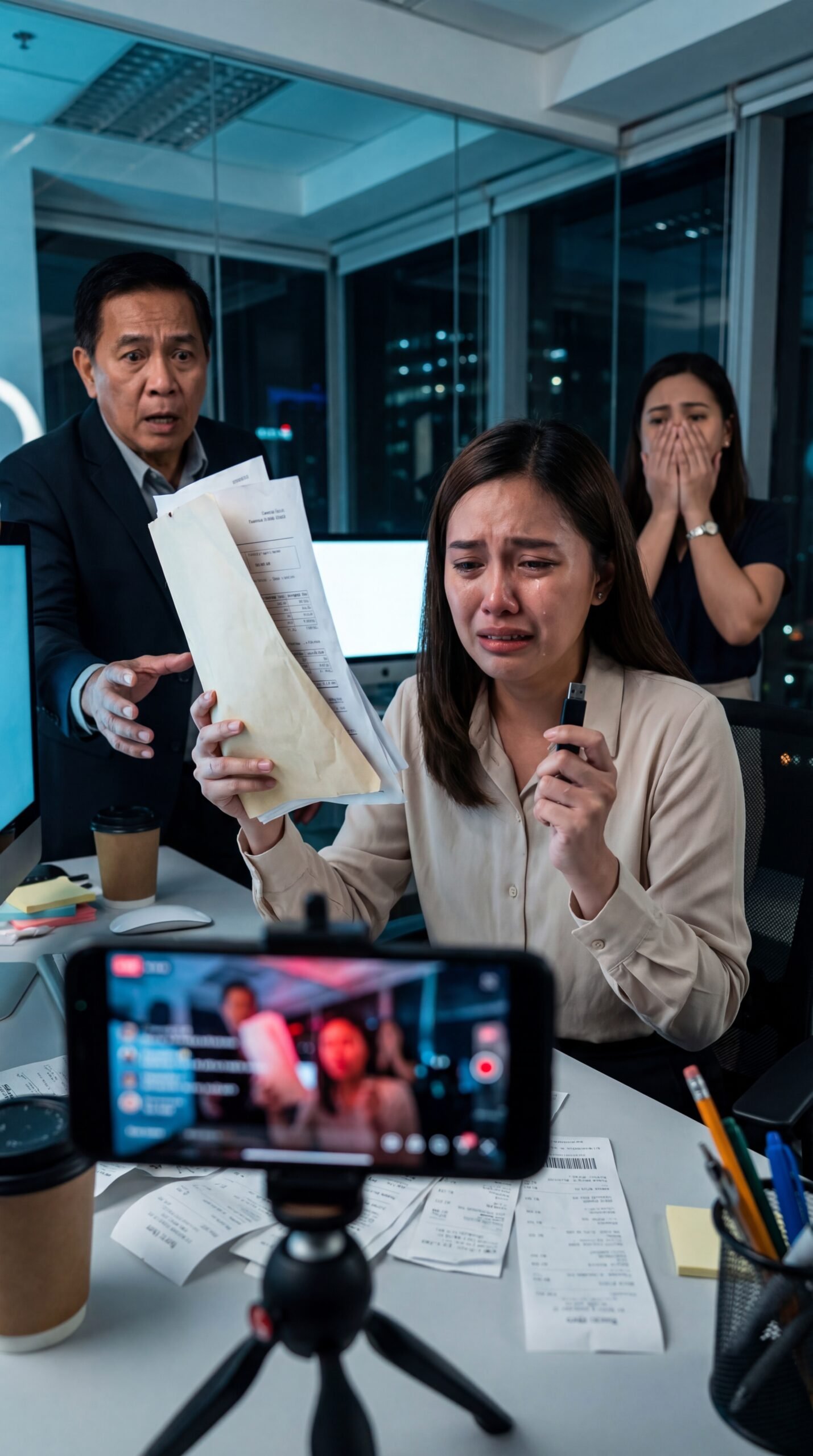 May mga gabi sa opisina na tahimik dapat—yung tipong ang tanging ingay lang ay ugong ng aircon at mahinang click ng keyboard. Pero sa gabing nasa larawan, ang katahimikan ay parang salamin na biglang nabasag. Sa harap ng malapad na bintana ng isang mataas na gusali, kita ang mga ilaw ng siyudad sa labas. Sa loob, sa ilalim ng malamlam na ilaw na kulay bughaw, may isang accountant na umiiyak habang hawak ang makapal na papeles sa isang kamay at isang maliit na USB sa kabila. Ang tanong ay isa lang: paano nauwi ang isang “ordinaryong overtime” sa sandaling sisira sa isang imperyo ng kasinungalingan?