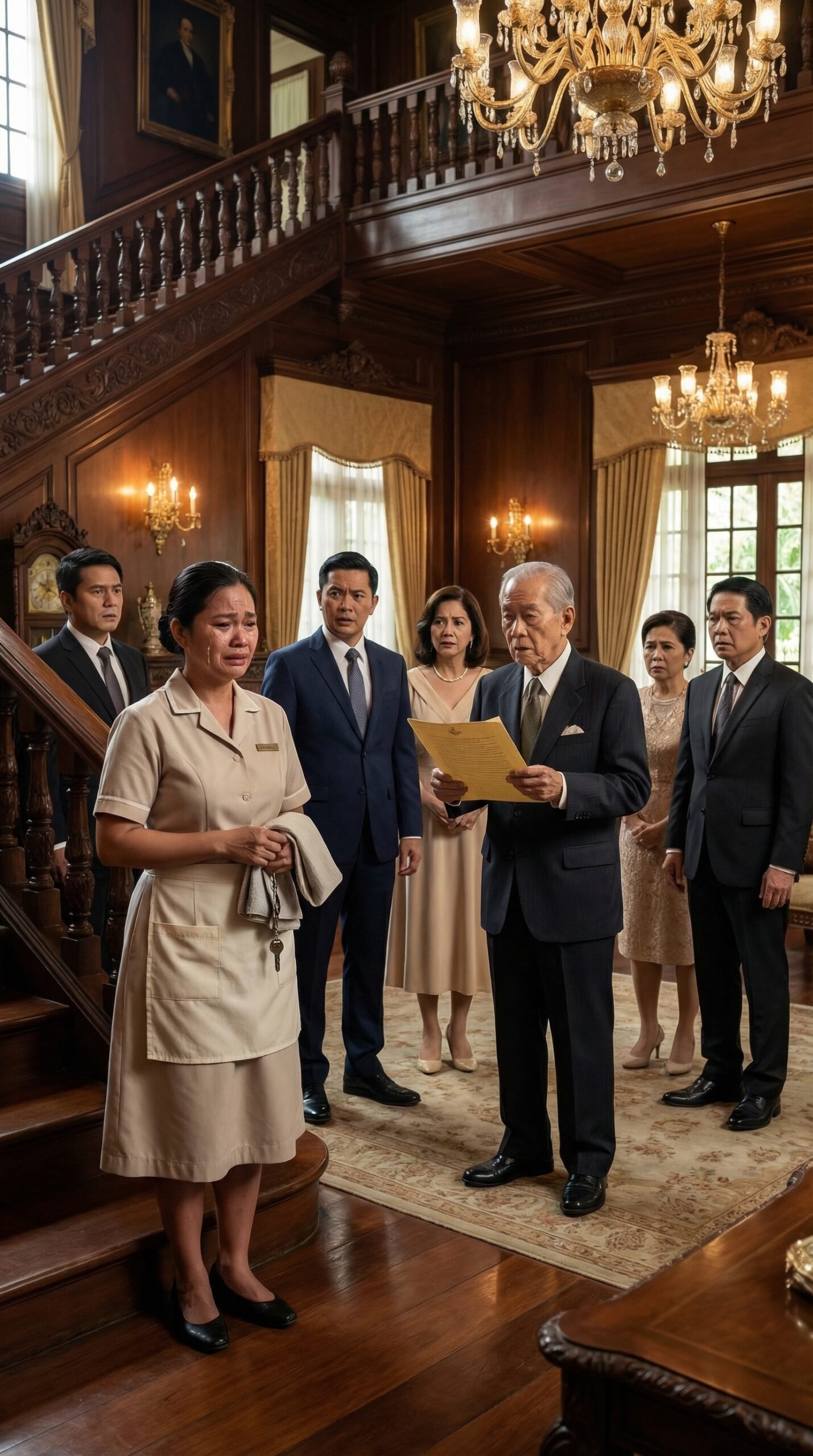 Nakatayo siya sa paanan ng malapad na hagdanan ng mansyon, suot ang payak niyang uniporme, hawak ang puting bimpo at ang maliit na susi na matagal nang nakakabit sa bulsa ng kanyang apron. Sa ilalim ng mamahaling ilaw ng mga chandelier, lalo siyang nagmukhang maliit. Sa harap niya, magkakatayo ang pamilya ng yumao—mga anak, manugang, at kamag-anak na sanay magsalita na parang pag-aari nila ang buong bahay, pati ang hanging umiikot dito. At sa gitna nila ay ang matandang abogado ng pamilya, tangan ang isang papel na ilang sandali na lang ay babasahin na.