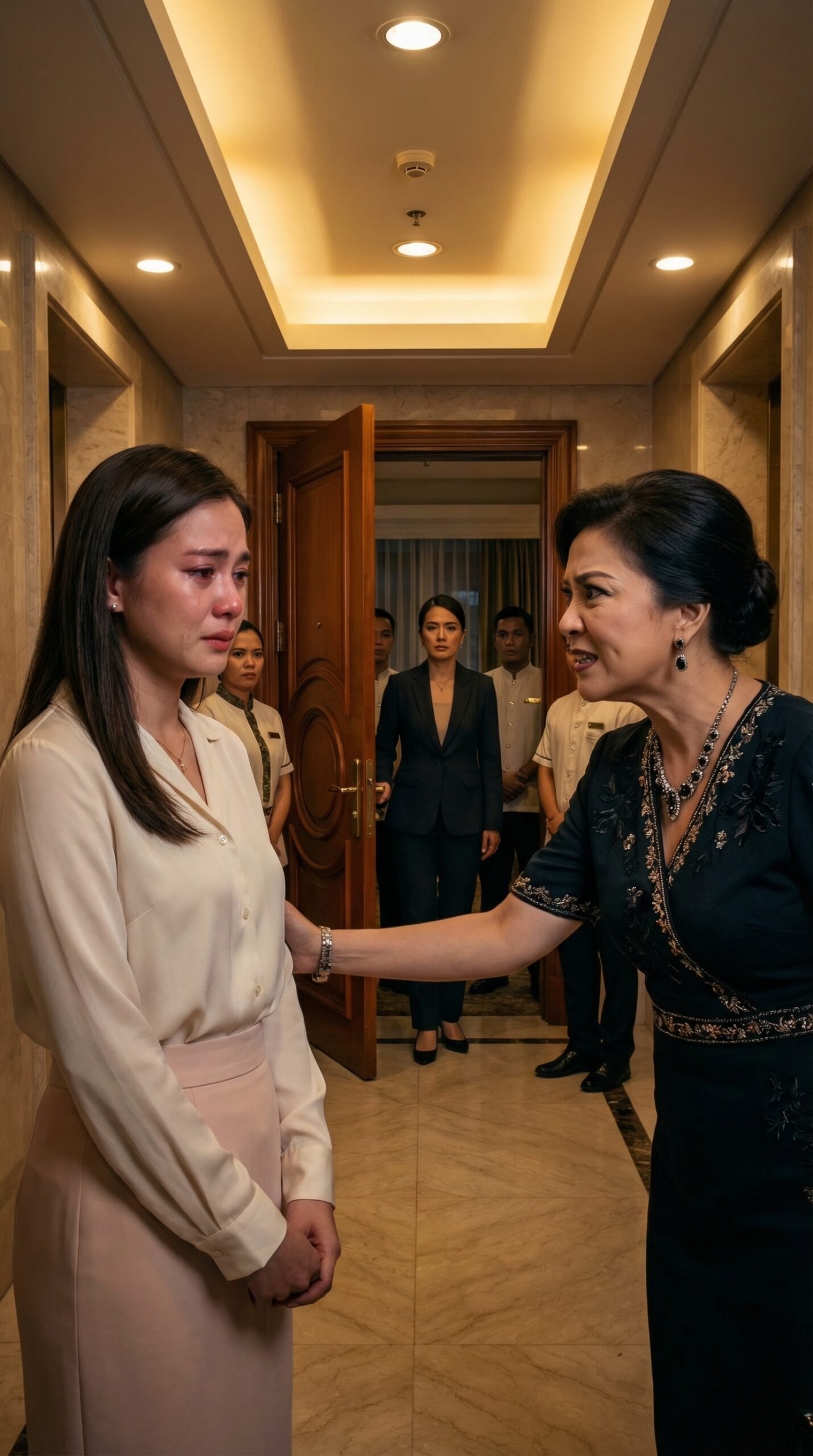 Sa makitid ngunit mamahaling hallway na naliliwanagan ng maiinit na ilaw sa kisame, nakasandal si Elia sa malamig na marmol na dingding, pilit pinipigilan ang paghikbi habang ang luha ay tuluy-tuloy na bumabagsak sa pisngi niya. Nakasuot siya ng simpleng puting blouse at mapusyaw na paldang hanggang tuhod, malinis ngunit halatang hindi sinadyang magpasikat. Sa harap niya, halos idikit na ni Doña Celina ang mukha nito sa kanya, matalim ang tingin, mahigpit ang panga, at ang isang kamay ay nakadiin sa braso ng dalaga na para bang gusto nitong ipaalala kung gaano kaliit ang tingin niya rito. Sa loob ng bukas na pinto sa likuran nila, may dalawang staff na naka-uniporme at isang babae sa maitim na suit na noon ay hindi pa tuluyang pumapasok, nakatingin lamang sa eksena na tila naghihintay kung sino ang unang bibigay.