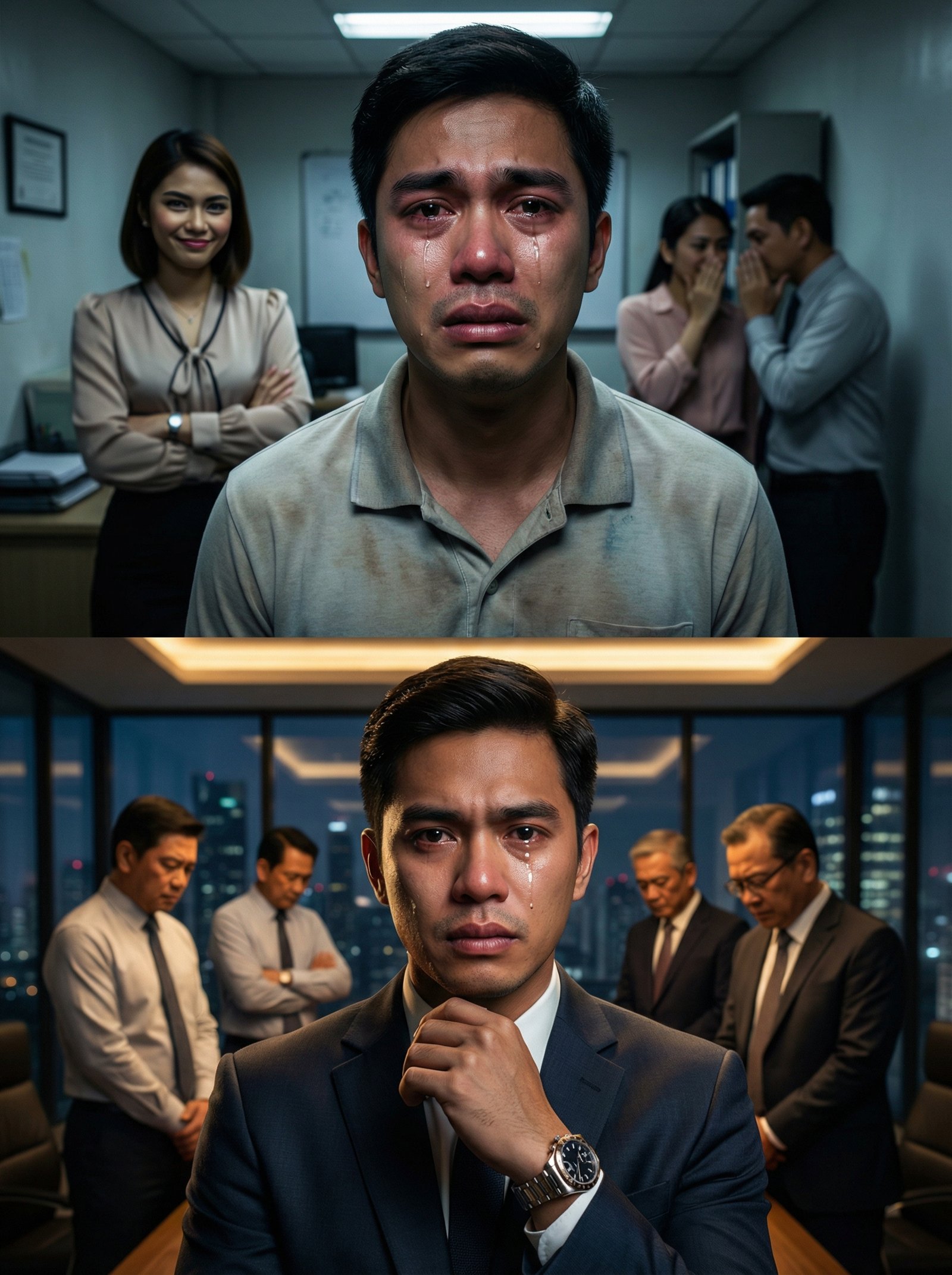 May mga araw na ang tao, kahit hindi pa tapos ang shift, tapos na ang loob. Sa unang larawan, kitang-kita ang ganung klase ng pagkawasak—isang lalaking nakatayo sa gitna ng opisina, marumi ang polo, pula ang mata, at luha ang dumadaloy na parang hindi na kayang pigilan ng kahit anong tapang. Sa likod niya, may babaeng nakangiti, nakatiklop ang braso—ngiting hindi nag-aalala, ngiting sanay manood ng pagbagsak. May dalawa pang tao sa sulok na nagbubulungan, parang ang sakit ng iba ay tsismis lang na pampalipas-oras. Kung may tanong kang gustong itanong sa litrato: anong kasalanan ang ginawa ng lalaking ito para umiyak sa harap ng mga taong walang puso? O mas masakit—wala ba talaga siyang kasalanan, kundi mahirap lang siya?