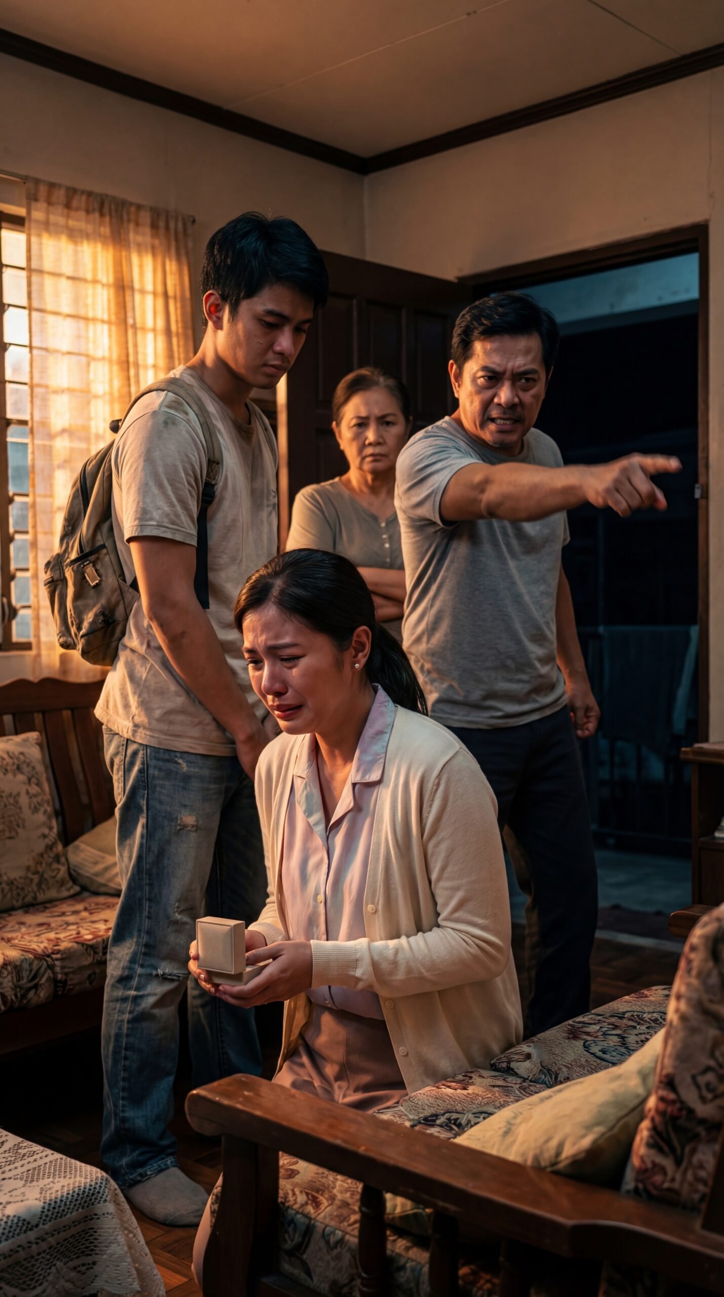 May liwanag na kulay kahel na pumapasok mula sa bintanang may kurtinang manipis, at sa loob ng lumang sala, parang mas mabigat ang hangin kaysa dati. Sa gitna ng silid, isang babae ang nakaluhod, umiiyak nang tahimik, hawak ang maliit na kahong puti na parang may itinatagong pangako o paalam. Naka-cardigan siya at simpleng damit, nanginginig ang mga daliri habang pinipigil ang hagulgol. Sa likod niya, isang binatang may backpack ang nakatayo, nakayuko ang ulo, parang napagod na sa pakikipaglaban kahit hindi pa nagsisimula. Sa may pintuan, isang lalaking galit ang nakaturo palabas, mahigpit ang panga, handang palayasin ang sinumang hindi niya gustong makita. At sa gitna nila, isang matandang babae ang nakatayo, nakapulupot ang braso sa dibdib, matalim ang tingin—parang hukom sa sariling bahay.