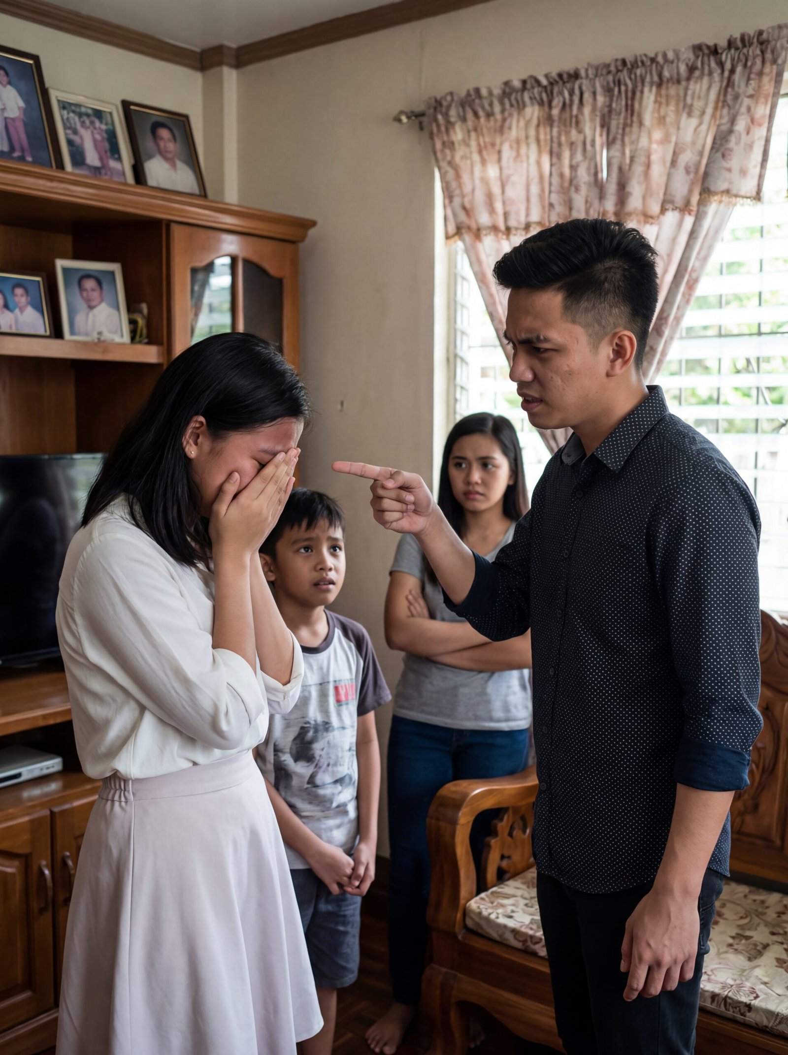 Hindi niya namalayang nakaturo na pala ang daliri niya sa mukha ng ina. Ang alam lang ni Adrian, sumabog na naman ang dibdib niya sa galit nang makita niyang may mga papel na nakalatag sa ibabaw ng mesa sa sala—mga papel tungkol sa bahay, sa lupang naiwan ng yumaong ama, at sa hatiang ayaw na ayaw niyang marinig. Sa gitna ng kanilang lumang sala na may malaking kahoy na kabinet, mga retratong nakapatong sa itaas nito, at liwanag na sumasala sa kupas na kurtina, nakatayo si Adrian na parang siya ang hukom ng lahat. Sa harap niya, si Aling Elena, nakaputing blouse at maputlang palda, nakatakip ang dalawang kamay sa mukha habang tahimik na umiiyak. Sa likod ng ina, naroon ang bunso nilang si Carlo, nanginginig ang labi, at ang kapatid niyang si Mae, nakatitig lang, parang sanay na pero sugatan pa rin.