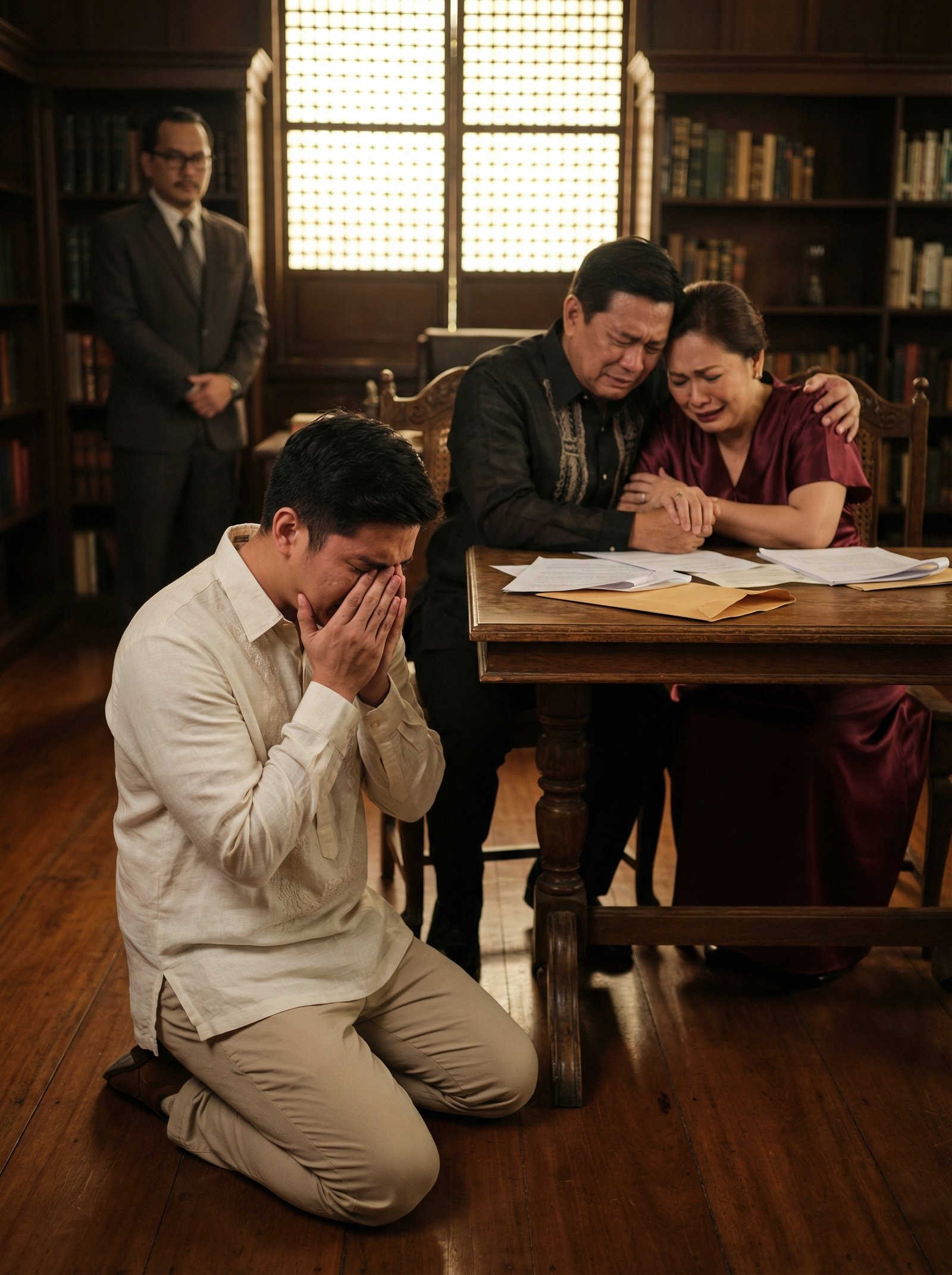 Sa loob ng lumang silid-aklatan ng kanilang ancestral house, mabigat ang hangin na parang kahit ang mga kahoy na sahig ay ayaw nang dumagdag sa ingay ng sakit. Sa gitna ng silid, sa harap ng matibay na mesang punô ng mga dokumento, nakaupo sina Don Emilio at Doña Teresa na kapwa basag ang mukha sa galit at sama ng loob. Sa likod nila, tahimik na nakatayo si Attorney Villamor, tuwid ang likod, hawak ang isang makapal na folder na tila mas mabigat pa sa lahat ng salitang mabibitawan sa araw na iyon. Sa harap ng mesa, nakaluhod si Rafael. Nakasubsob ang mukha sa mga palad, nanginginig ang balikat, at parang wala nang natitirang lakas para ipagtanggol ang sarili. Matagal na siyang hinatulan ng bahay na iyon. Ngayon, papel na lang ang kulang.