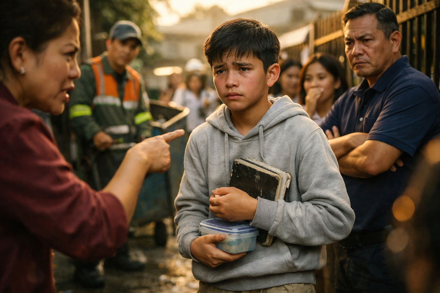 Sa mismong sandaling tumuro ang daliri ni Ma’am Lorna sa mukha ng bata at lumakas ang boses niya sa harap ng gate, hindi na gumalaw si Jomar. Nakatayo lang siya sa ilalim ng huling init ng umagang kumakapit sa basang lupa, hawak ang lumang libro na halos matuklap na ang cover, at may maliit na plastic na baunan sa kabilang kamay. Nakayuko ang ulo niya pero hindi dahil guilty—kundi dahil sanay na siya. Sa likod nila, may mga matang nakasilip at mga bibig na handang maghusga, habang sa dulo ng kalsada, isang truck ng basura ang nakahinto, at may lalaking naka-orange na may reflective na guhit ang uniporme, nakatitig na parang pinipigil ang sarili. Ang tanong ay isa lang: kapag anak ka ng basurero, kailangan bang palagi kang mapagkamalang magulo?