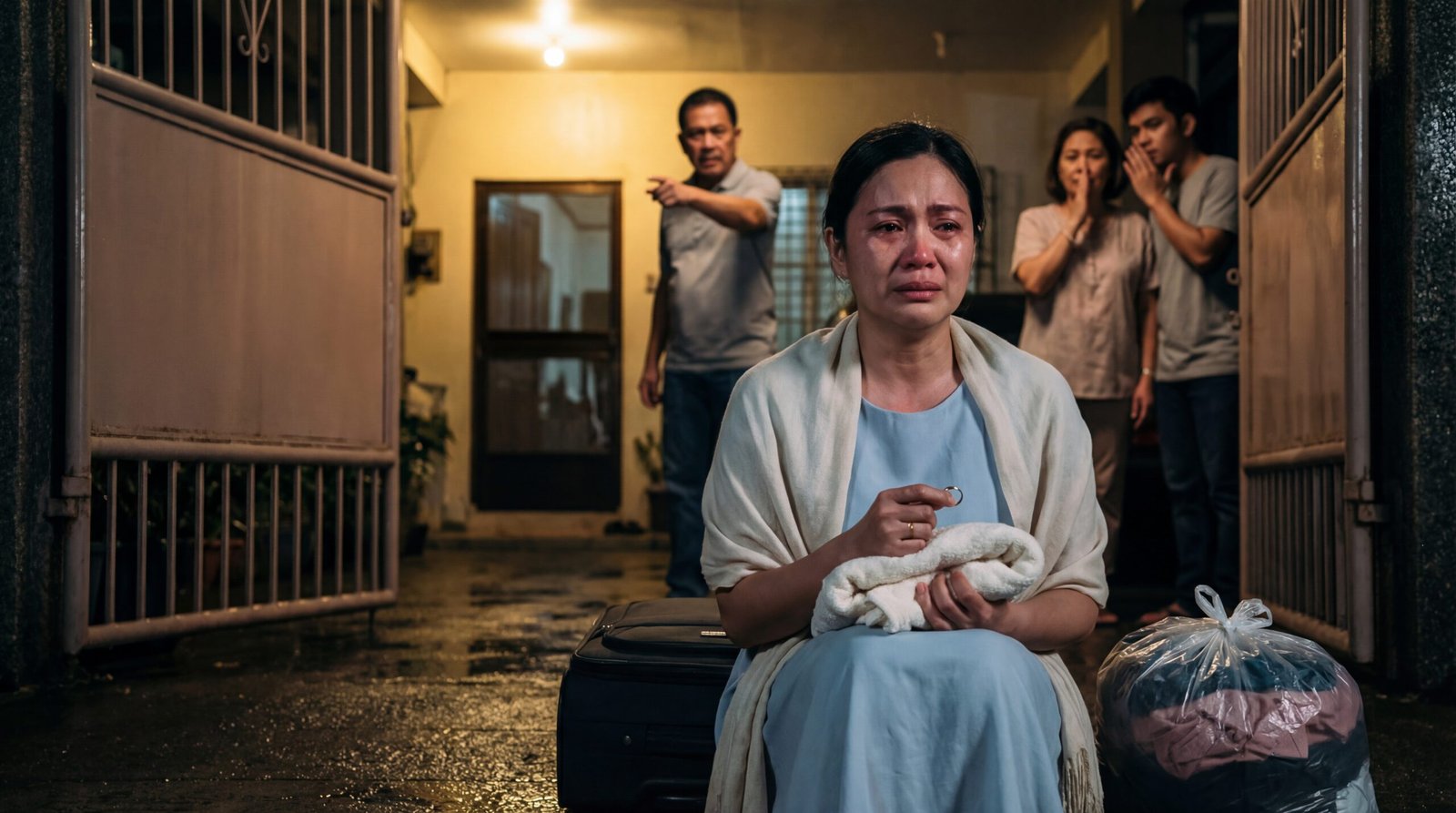 Sa ilalim ng dilaw na ilaw sa tapat ng bahay, may isang babaeng nakaupo sa malamig na semento—namumula ang mata, nanginginig ang baba, at pilit na hinahawakan ang sarili para hindi tuluyang bumigay. Sa isang kamay, may hawak siyang singsing na parang huling piraso ng pangakong binasag. Sa kabila, nakadantay ang maleta na tila ba iyon na lang ang buong buhay niyang naipon. Sa tabi niya, may supot ng damit—halatang minadali ang pag-iimpake, halatang hindi niya pinili ang pag-alis. At sa loob ng bakod, may lalaking nakaturo sa kanya, galit ang mukha, parang ang pag-iyak niya ay kasalanan. Sa likod ng lalaki, may babaeng nakapamewang, at may binatang nakatakip ang bibig sa gulat—pero walang lumalapit para pigilan ang nangyayari. Ang tanong ay isa lang: paano nagiging “walang silbi” ang isang asawa dahil lang sa salitang baog?