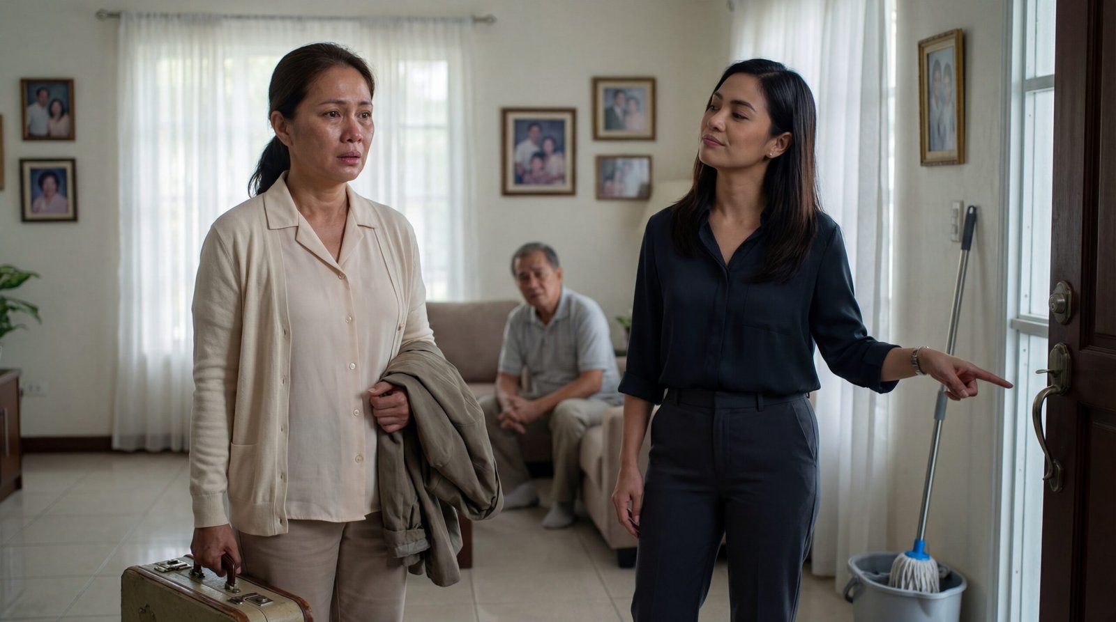Sa gilid ng pintuan, may isa pang babae—mas bata, mas maayos ang bihis, naka-itim na blouse at slacks, at ang ekspresyon ay hindi pag-aalala kundi kumpiyansang may halong pangmamaliit. Itinuturo niya ang pinto palabas, parang simpleng utos lang ang magpaalis ng tao. “Doon,” sabi ng kilos ng daliri niya, na para bang ang nasa harap niya ay hindi kapatid kundi tauhan. Sa likod, sa sofa, nakaupo ang isang matandang lalaki, nakayuko, tahimik, at ang mukha’y puno ng pag-aalangan—parang alam niya ang mali, pero sanay na siyang manahimik kapag may mas malakas na boses sa bahay.