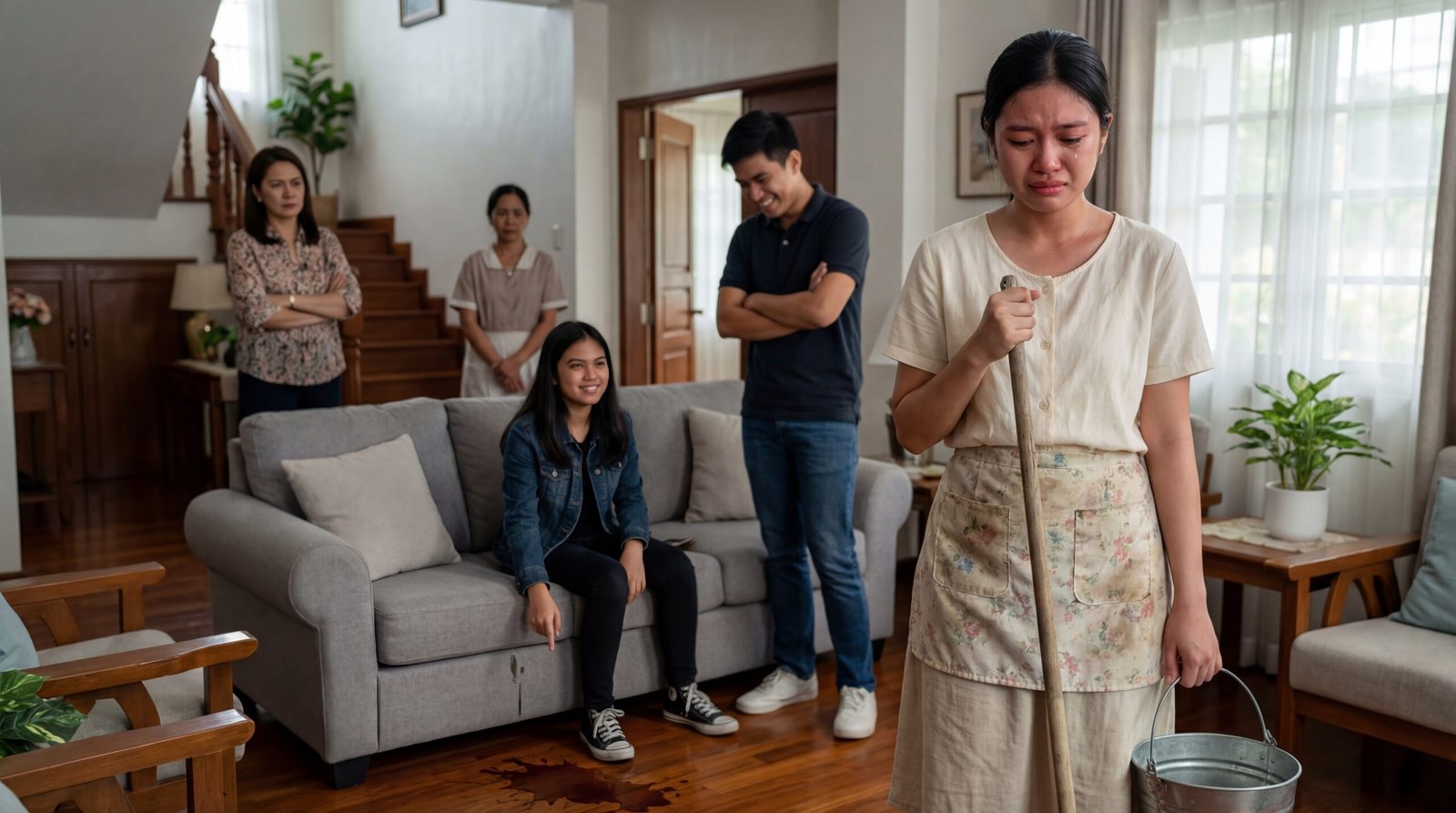 May mga bahay na malinis ang sahig pero marumi ang trato. Sa gitna ng maliwanag na sala—may malaking bintana, maayos na sofa, at amoy ng bagong linis—nakatayo si Mara, umiiyak nang tahimik habang hawak ang mop na parang iyon na lang ang sandalan niya para hindi tuluyang bumagsak. Sa isang kamay, may timba na kumakalansing, at sa sahig sa harap niya, may natapong inumin na parang sinadya para may ipunas ulit siya. Sa sofa, nakaupo ang isang dalagang nakangisi at itinuturo ang mantsa na parang nakakatuwang palabas. Sa likod, isang lalaki ang nakatayo, nakatawa habang naka-cross arms, at sa gilid, isang babaeng mas matanda ang malamig ang tingin—parang siya ang batas sa bahay. May kasambahay pang nakatayo sa malayo, tahimik lang, at isang matandang babae sa may hagdanan na nakapamewang, parang matagal nang alam ang eksenang ito. Ang tanong: paano naging “katulong” ang babaeng ampon sa bahay na tinawag niyang pamilya?
