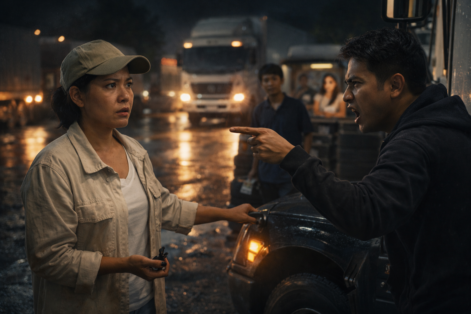 Sa ilalim ng madilim na langit at basang kalsada, ang truck stop ay parang lumang pelikula—mga ilaw na nanginginig sa ulan, mga headlight na sumasalamin sa putik, at amoy ng diesel na humahalo sa malamig na hangin. Pero sa isang sulok, mas malakas pa sa tunog ng rumaragasang trak ang isang boses na naglalagablab sa galit. Isang lalaki, naka-hoodie, nakasandal sa gilid ng sasakyan, nakaturo ang daliri na parang kutsilyong gustong sumugat. Sa harap niya, isang babae ang nakatayo—may cap, nakasuot ng mapusyaw na jacket, hawak ang susi na parang huling kapit sa dignidad. Tahimik ang mukha niya, pero ang mga mata niya, punô ng pagod na matagal nang kinikimkim.