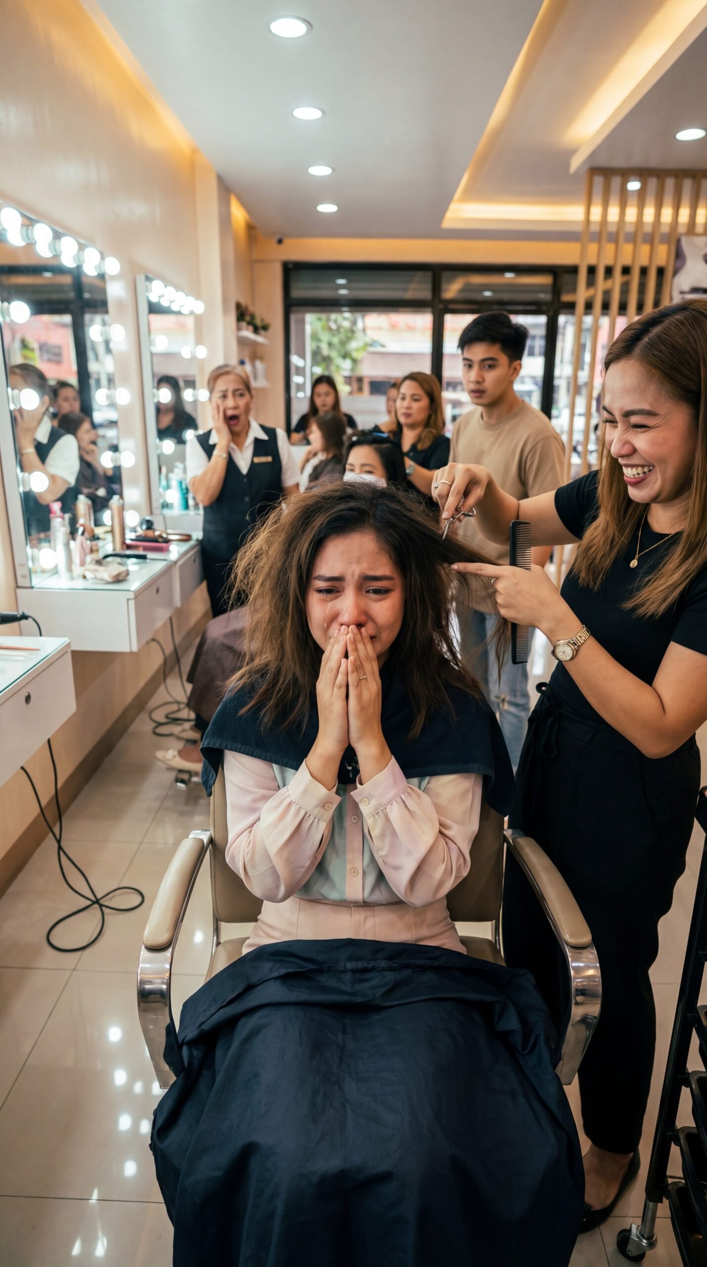 Sa loob ng salon na punô ng ilaw na nakapalibot sa salamin, may isang tunog na mas malakas pa sa hair dryer—ang pigil na hikbi ng isang babae sa barber chair. Nakaupo siya sa gitna, balot ng itim na cape, nanginginig ang balikat habang magkadikit ang palad sa harap ng bibig na parang nagdarasal na sana matapos na ang kahihiyan. Gusot at buhaghag ang buhok niya, parang sabay-sabay tinakbo ng bagyo at pagod. Sa kanan niya, nakatayo ang stylist na naka-itim din, nakangisi, hawak ang gunting at suklay, at tumatawa na parang laro lang ang buhok ng kliyente. Sa likod, may mga taong nakatingin—isang staff na napapahawak sa pisngi sa gulat, isang binatang nakatulala, at ilang kustomer na napatingin sa eksena na parang hindi alam kung makikialam o manonood na lang.