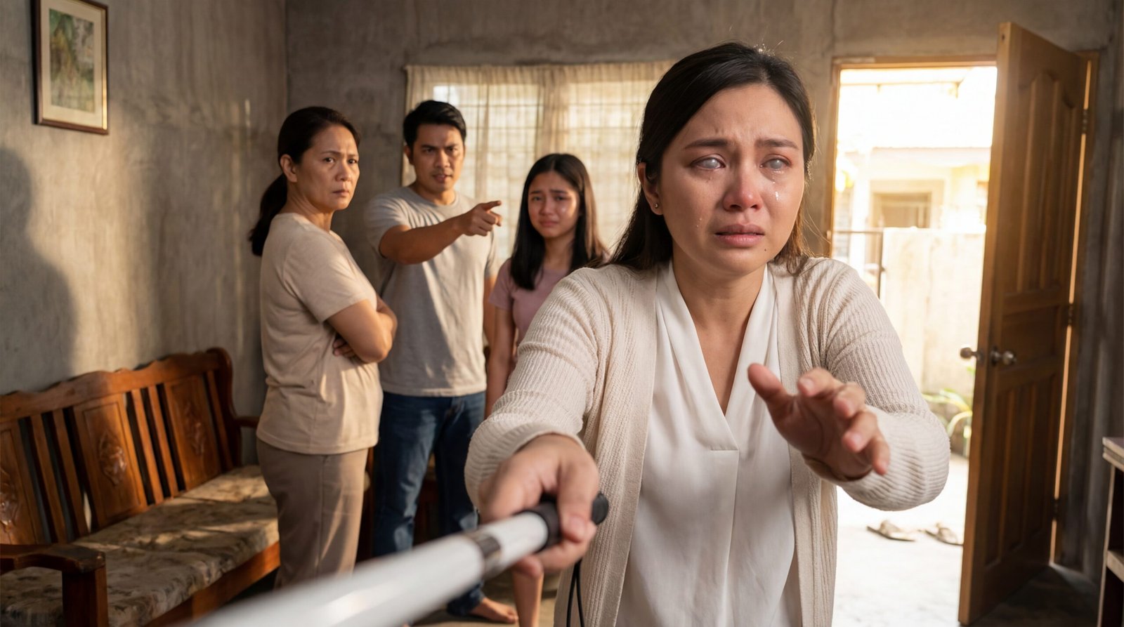 May mga luha na hindi lang basta luha—parang huling patak bago tuluyang mamatay ang ilaw ng mundo mo. Sa loob ng lumang bahay na may sementadong pader at kurtinang kupas sa bintana, isang babaeng nanginginig ang kamay habang hawak ang puting tungkod. Ang isa niyang palad ay nakaabot sa hangin, parang naghahanap ng pader, ng upuan, o ng kahit anong sasalo bago siya tuluyang bumagsak. Namumula ang mga mata niya, basang-basa ang pisngi, at kahit nakatingin siya sa harap, halatang hindi niya na nakikita ang direksyon ng buhay na tinatahak niya. Sa likod niya, may tatlong anyo ng katotohanan: isang matandang babaeng nakapulupot ang braso sa dibdib—matigas ang mukha, walang lambing; isang lalaking nakaturo, galit ang boses kahit hindi mo marinig; at isang dalagitang umiiyak, pinipigilan ang hikbi na parang bawal maging mahina sa bahay na ito. Ang tanong ay isa lang: hanggang saan aabot ang isang tao kapag ang mismong pamilya niya ang unang nagpatay ng pag-asa?