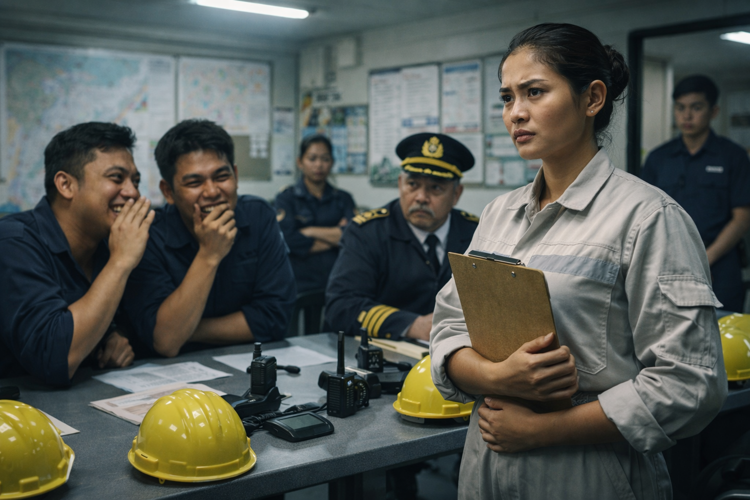 Sa loob ng cargo ship briefing room, malamig ang ilaw at mas malamig ang tingin. Sa mesa, nakahilera ang mga dilaw na hard hat, parang paalala na dito, mali ang isang hakbang, buhay ang kapalit. May mga walkie-talkie na nakahandusay, mga papel na nakakalat, at isang lumang mapa sa dingding na may mga marka—mga ruta, hazard points, at mga lugar na hindi puwedeng magkamali. Sa gitna ng kwarto, nakaupo ang ilang seaman, nakasandal, parang reunion lang at hindi safety briefing.