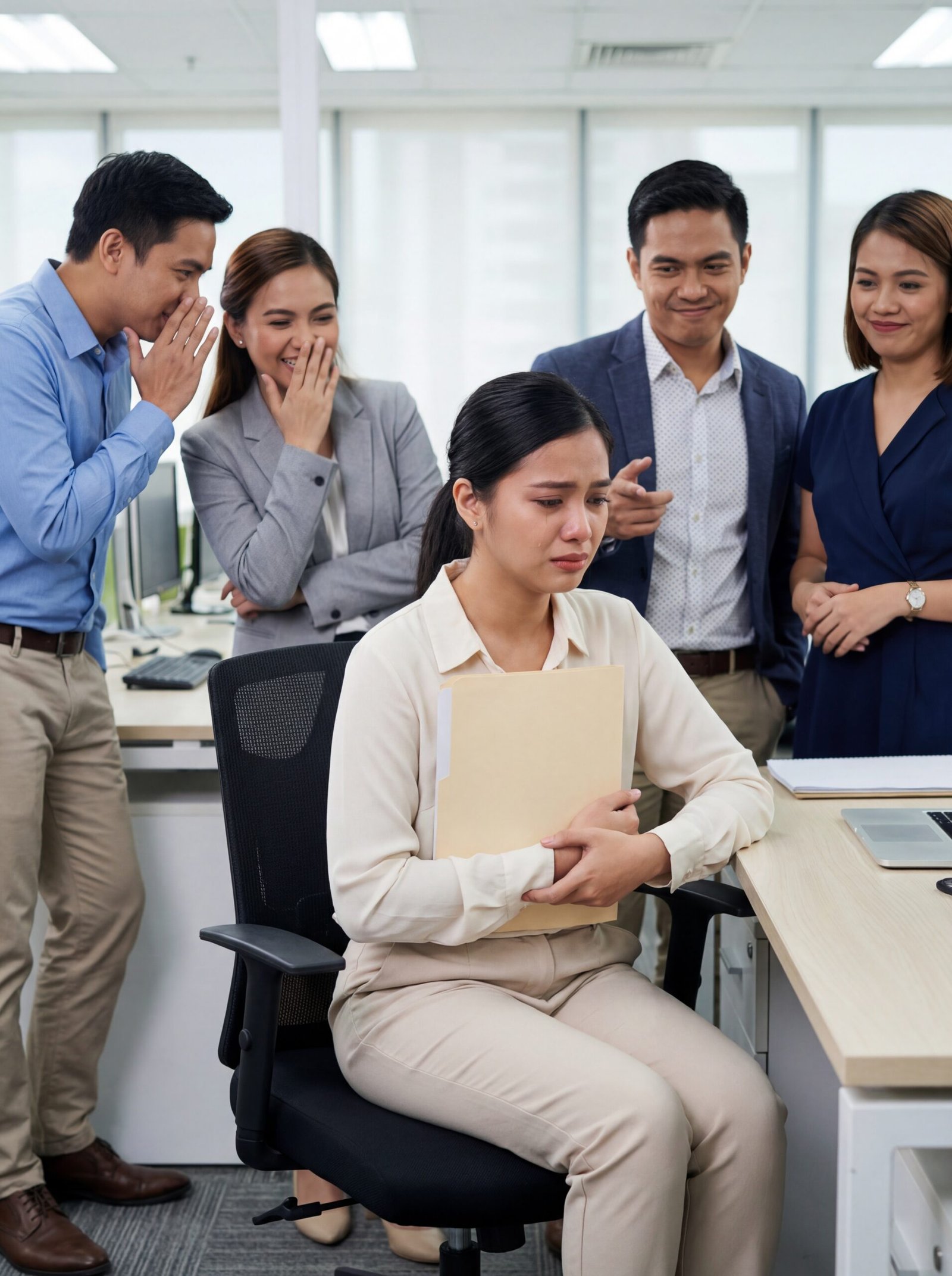 Nakaupo siya sa itim na swivel chair sa gilid ng mahabang mesa, yakap ang manila folder sa dibdib na para bang iyon na lang ang natitirang depensa niya laban sa mga matang nakatutok sa kanya. Sa harap niya ay isang bukas na laptop, malamig ang ilaw ng screen, pero mas malamig ang hangin sa paligid. Sa likod niya, kitang-kita ang apat niyang katrabaho—isang lalaking naka-asul na long sleeves na bahagyang nakayuko habang may ibinubulong, isang babaeng naka-gray blazer na nakatakip ang kamay sa bibig habang pigil ang tawa, isang lalaking naka-amerikana na nakaturo pa sa kanya na parang may nakakatuwang palabas, at isang babaeng nakangiti lang sa gilid, tahimik pero halatang kasali sa pangungutya.