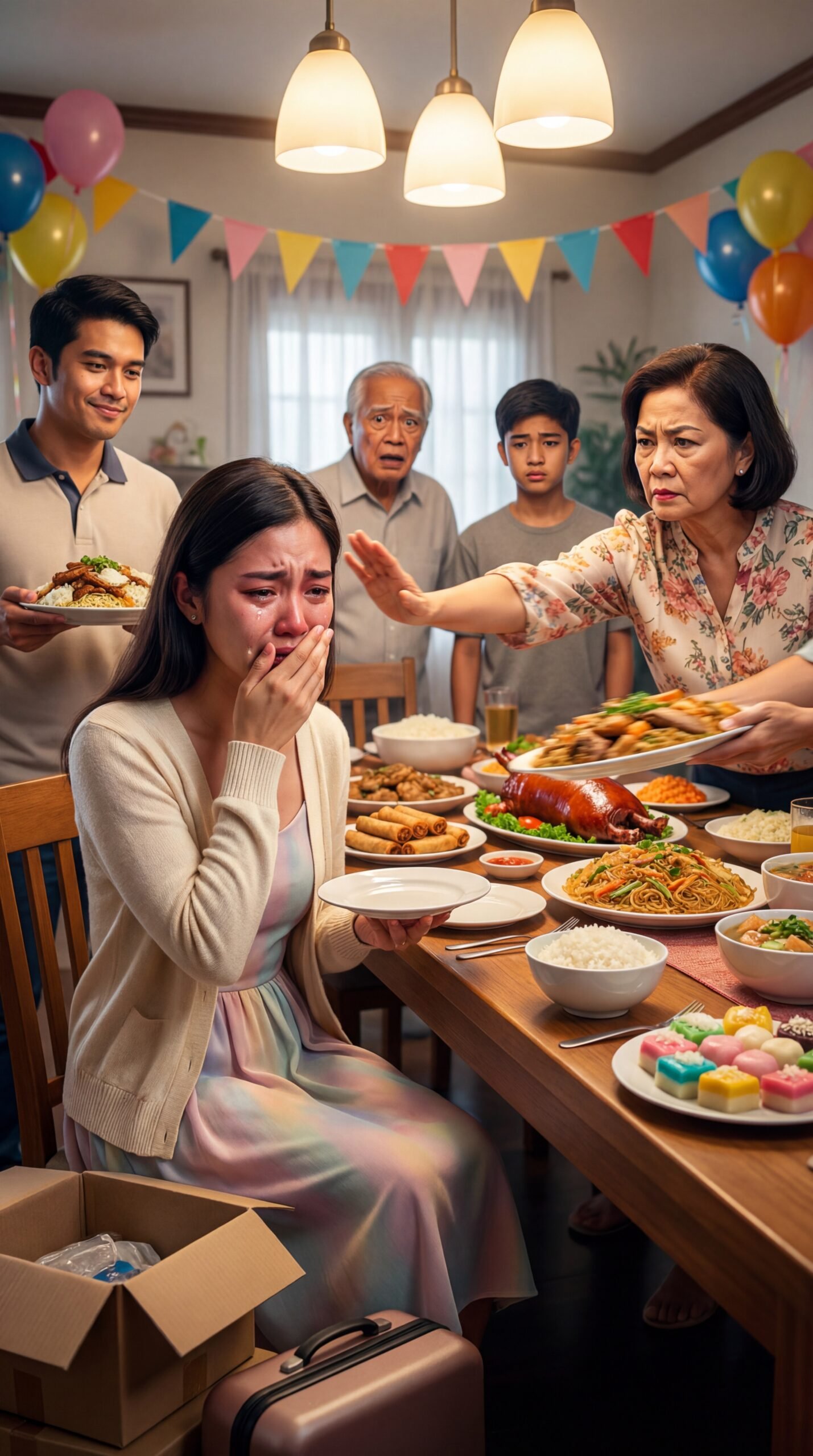 Sa ilalim ng tatlong ilaw na nakabitin sa kisame, kumikislap ang mga bandeeritas at lobo na kulay pula, dilaw, asul—parang masaya dapat ang gabi. Nasa gitna ng sala ang mahabang mesa na puno ng handa: malaking lechon na makintab ang balat, pancit na nakabundok, lumpiang nakaayos sa plato, mangkok-mangkok na kanin, at mga kakaning makukulay sa dulo. Ngunit sa kabila ng dami ng pagkain, may isang taong halos walang mailagay sa plato niya.