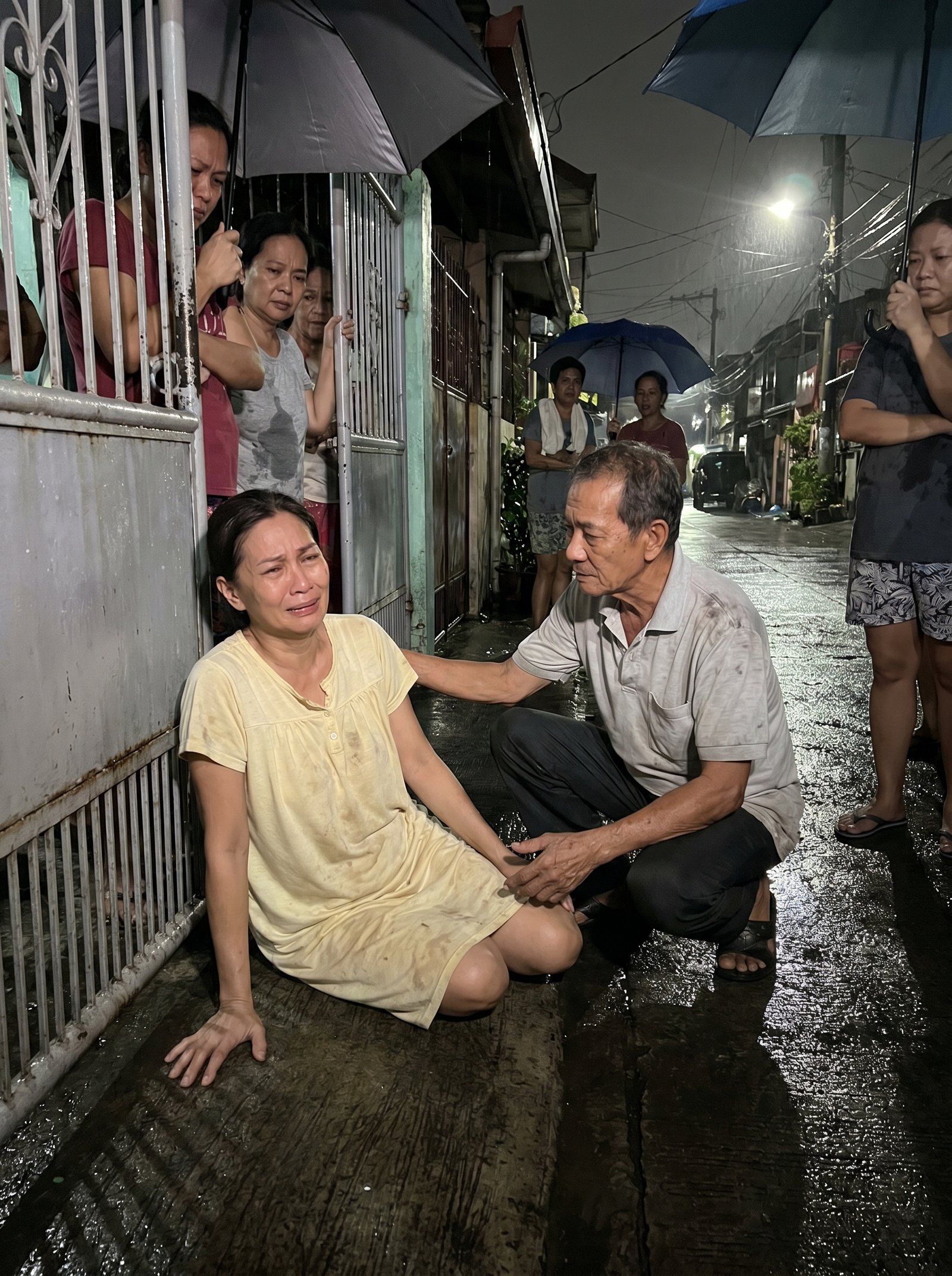 Sa makitid na eskinita, kumikislap ang ilaw ng poste sa mga patak ng ulan. Nakabukas ang mga payong ng ilang kapitbahay. Ang iba, nakatanaw lang mula sa likod ng rehas ng mga pinto. Ang iba, sumisilip mula sa gilid ng dingding na parang hindi makapaniwala sa eksenang nasa harap nila.