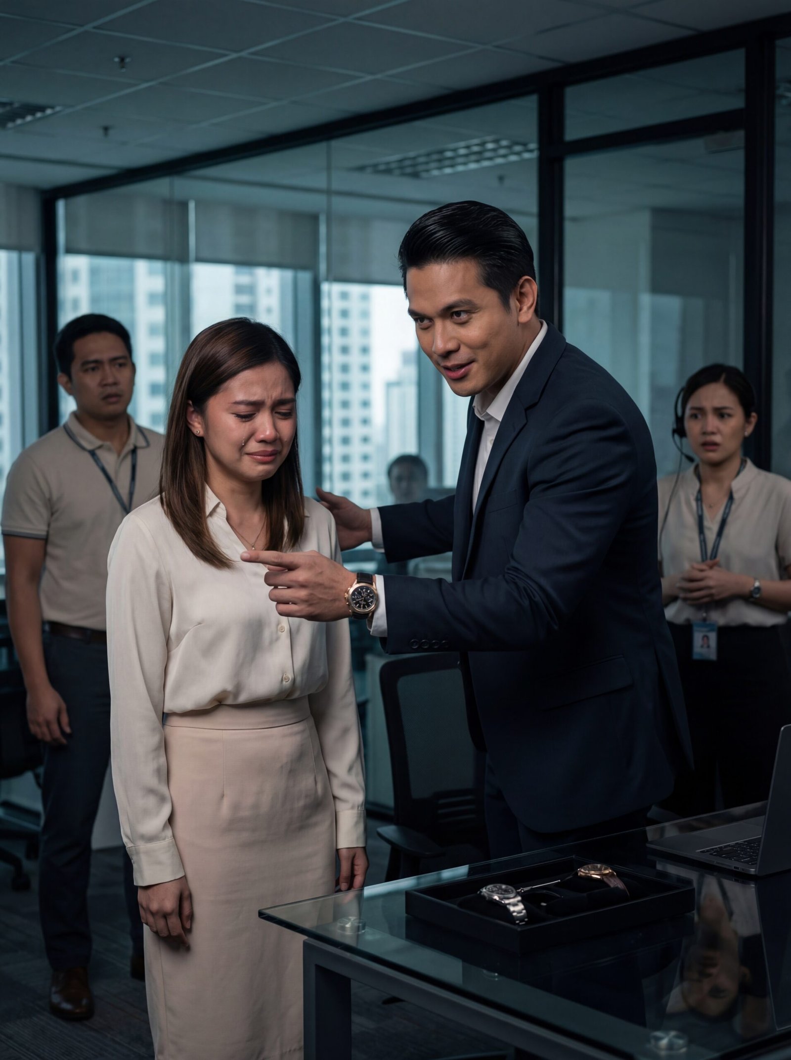 Pagsapit ng gabi, hindi na sa staff kumakalat ang bulung-bulungan kundi sa mismong boardroom. Tinawagan si Marco. Pinapunta agad. Hindi na siya makatawa nang malakas doon. Wala nang madla na puwedeng maliitin. Wala nang empleyadong puwedeng paiyakin para maramdamang siya ang hari.