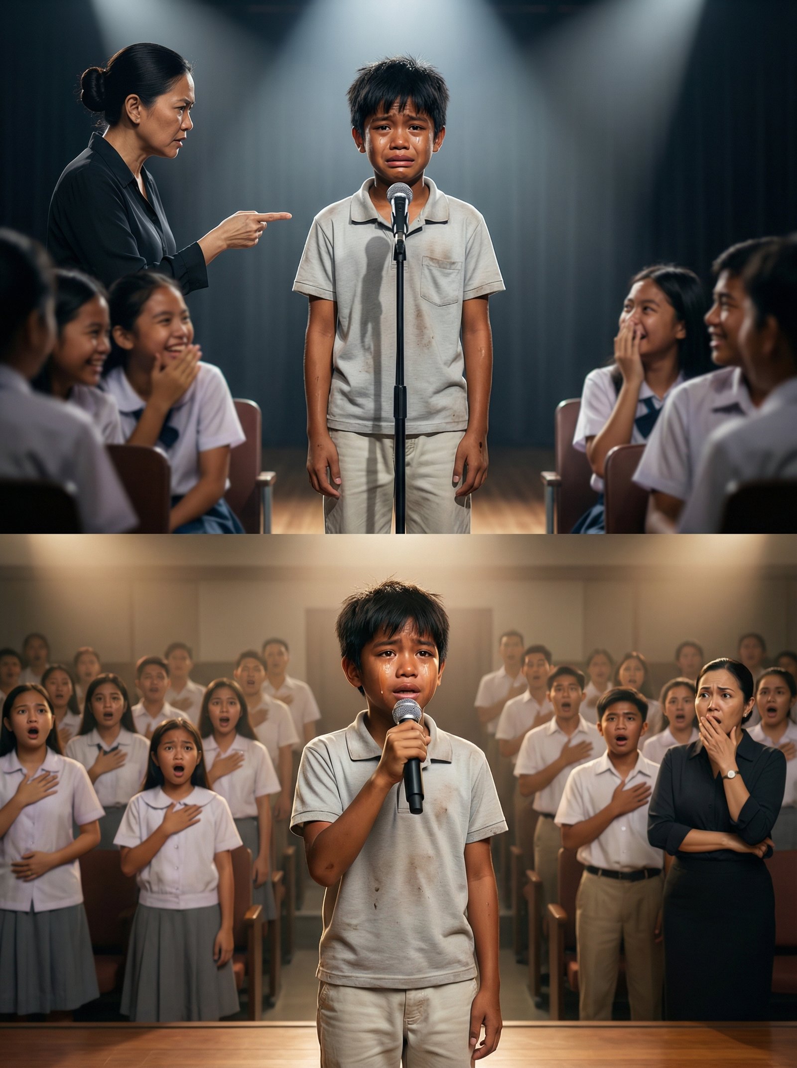 May mga paaralan na dapat ligtas—dapat tahanan ng pangarap, hindi kulungan ng hiya. Pero sa araw na ‘yon, sa lumang auditorium ng San Isidro National High School, ang entablado ay naging hukuman, at ang isang batang ulila ang ginawang akusado. Si Nico—labindalawang taong gulang, payat, gusot ang polo, at may mga mantsa sa laylayan na halatang hindi na bago—ay nakatayo sa gitna ng spotlight. Sa harap niya, isang mikropono na mas mataas pa sa kumpiyansa niya. Sa gilid, nakatayo si Ma’am Dalia, ang guro sa Music, nakapamewang, nakakunot ang noo, at nakaturo ang daliri na parang kutsilyong hindi nakikita. Sa mga upuan, may mga kaklase siyang nagpipigil ng tawa, may iba na nakatakip sa bibig, may ibang nakasimangot na parang “ay, kawawa,” pero walang tumatayo para pigilan.