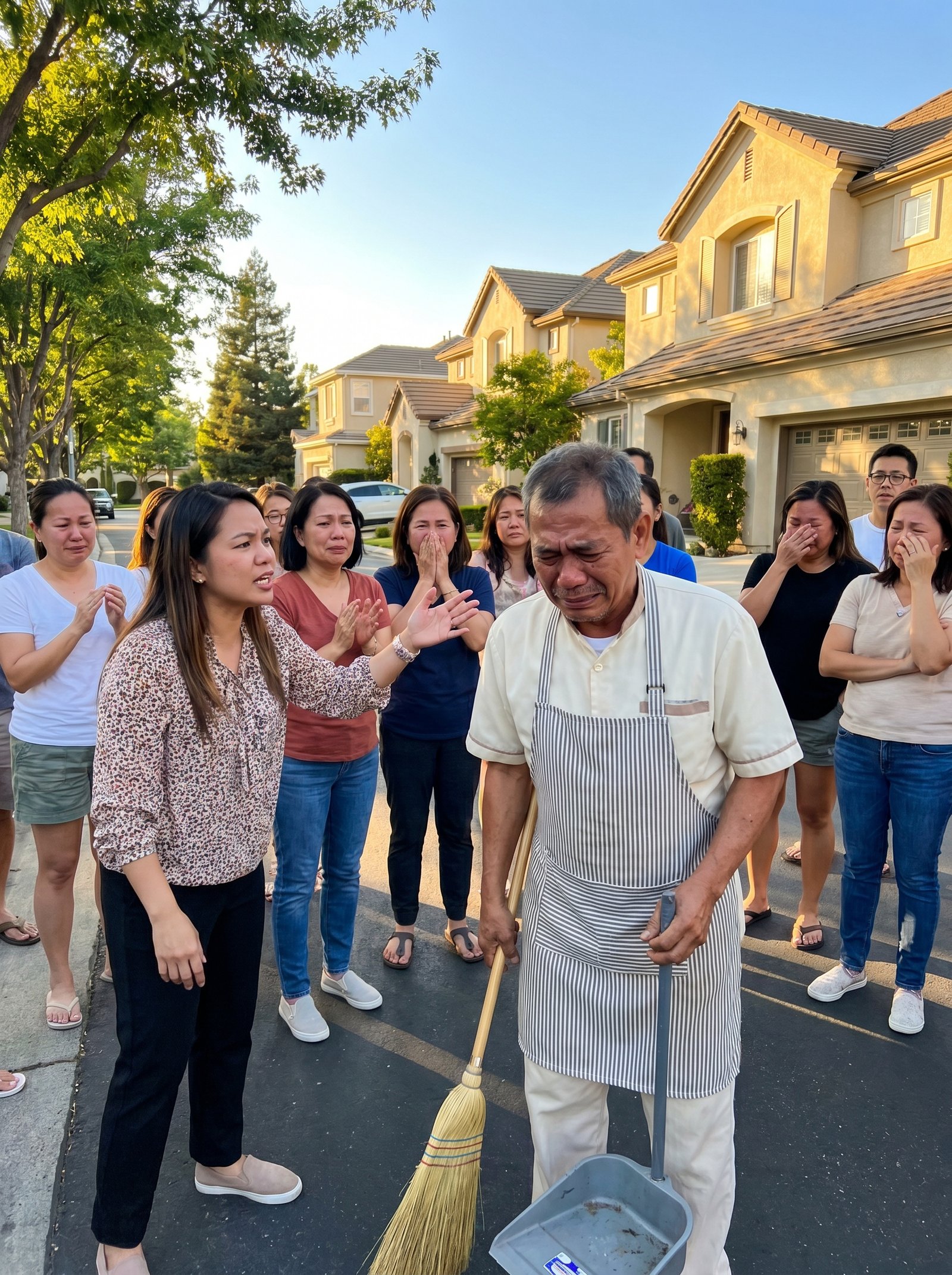 Walang naghanda sa tahimik na subdivision na iyon para sa eksenang sumabog sa gitna ng maliwanag na hapon. Sa malapad na kalsadang napapaligiran ng mamahaling bahay, malilinis na driveway, at mga punong sinasalo ang ginintuang sikat ng araw, nakatayo ang isang matandang lalaki na suot ang simpleng uniporme ng kasambahay. May guhit-guhit na apron sa harap niya. May walis sa isang kamay. May dustpan sa kabila. Nakayuko siya, nanginginig ang balikat, at hindi na mapigilan ang luhang tumatakbo sa mukha niya. Sa harap niya, isang babaeng galit na galit ang nakataas ang kamay, hindi para manakit, kundi para idiin ang bawat salitang matagal na niyang kinikimkim laban sa lalaking akala niya ay isa lamang utusan na puwedeng pagalitan sa gitna ng lahat.