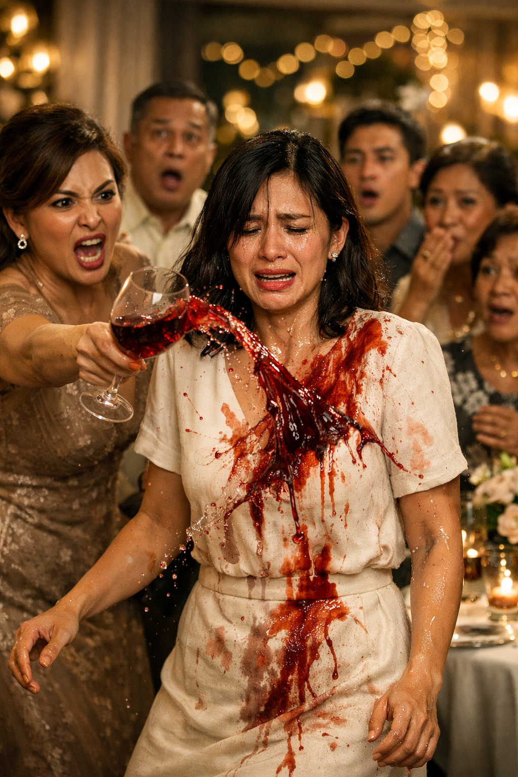At saka nangyari ang hindi na mababawi. Habang nakatingin ang lahat, lumapit si Celeste kay Eliana, kunwa’y may ibubulong. Ngunit sa halip, bigla niyang ibinuhos ang laman ng wine glass sa dibdib at mukha nito. Sabay humiyaw si Tita Viola, “Ayan! Baka sakaling matuto kang huwag magmukhang kawawa sa reunion ng pamilyang hindi mo naman kayang sabayan!” Napasinghap ang buong bulwagan. Ang pulang alak ay kumalat sa puting bestida ni Eliana, tumulo sa katawan niya na parang dugo ng mga taon ng pananahimik. Napapikit siya sa lamig at sa sakit ng kahihiyang ibinato sa harap ng lahat. Ngunit wala pang nakakaalam na ang gabing iyon ay hindi pa tapos. At ang pulang bahid na akala ng pamilya niya ay tanda ng pagkapanalo nila, ay siya palang magiging simula ng kanilang pinakamabigat na katahimikan.