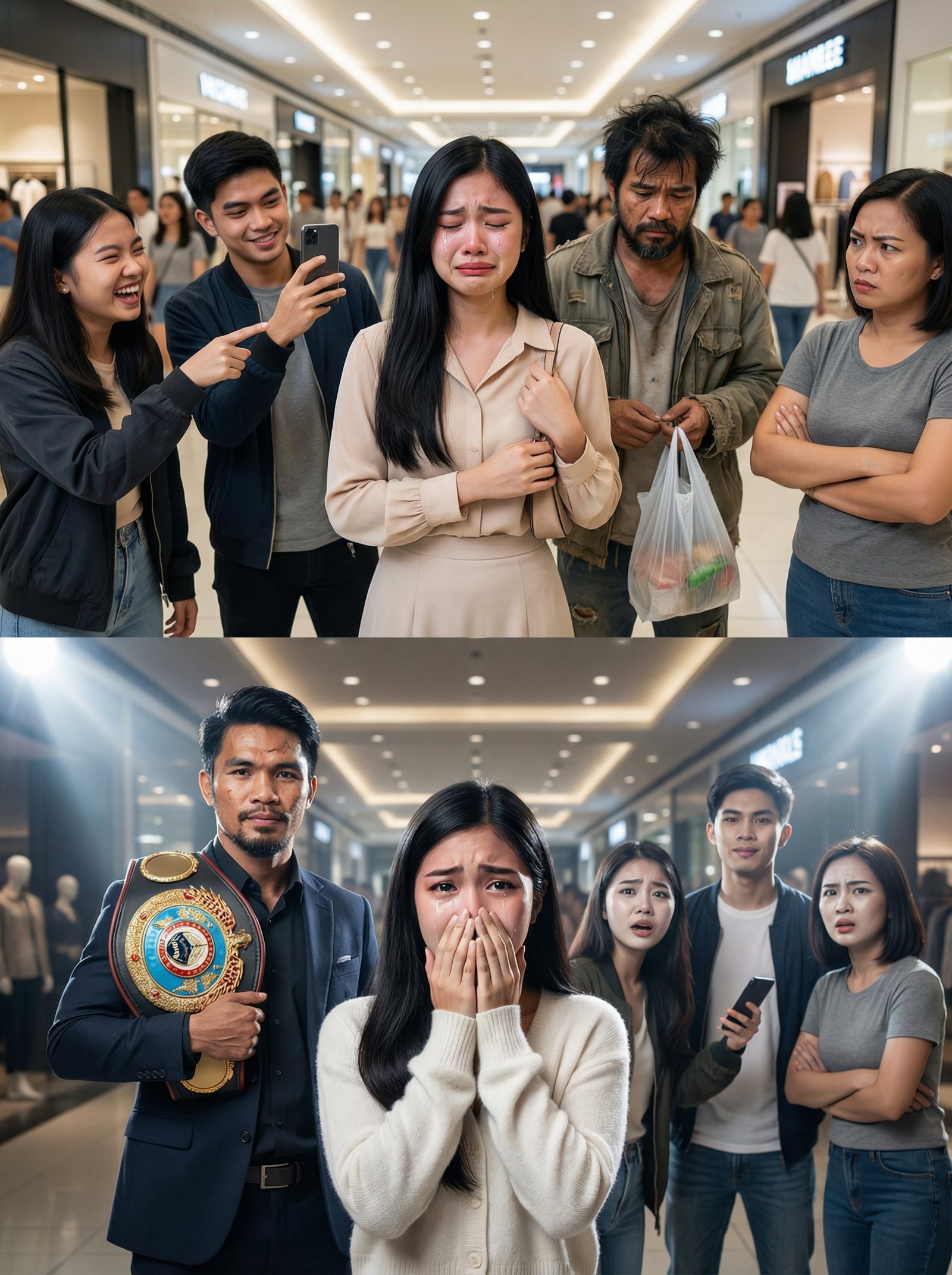 “Mr. Ruben…” narinig ng crowd. Tumigil ang tawa. Tumigil ang pang-aasar. Parang may humigop ng hangin sa buong mall. “Mr. Ruben Ferrer,” dagdag ng reporter, “CEO ng Ferrer Group of Companies… at kasalukuyang World Boxing Champion—ang tinatawag na Boxing King.” Bumagsak ang phone ng binatang nagvi-video nang bahagya, parang nawalan siya ng lakas. Si Maris, namutla, nakapulupot pa rin ang braso pero halatang nanginginig. “Hindi… imposible…” bulong niya. Ngunit hindi ito ilusyon. Lumapit si Ruben sa harap, at sa unang pagkakataon, hindi na siya nagtatago. “Pinili kong magmukhang pulubi,” sabi niya, “dahil gusto kong makita kung sino ang may pusong tao at sino ang may pusong pandurog.” Tumingin siya kay Yna, at doon siya bahagyang nanginig—hindi sa takot sa crowd, kundi sa takot na baka nasaktan niya si Yna sa pagtatago. “Mahal,” bulong niya, “hindi ko itinago ‘to dahil nahihiya ako sa’yo. Itinago ko ‘to dahil may mga taong gustong gamitin ka laban sa akin. At ayokong ikaw ang maging target.” Umiyak si Yna nang mas malakas, pero iba na ang luha—luha ng gulat, luha ng bigat, luha ng pag-unawa na ang lalaking minahal niya ay may mundong matagal niyang pinasan mag-isa. Sa likod nila, may mga taong dati’y tumatawa, ngayon ay nakatungo. At sa gitna ng mall, kung saan ginawang entablado ang hiya ni Yna, doon din babalik ang dignidad niya—mas maliwanag pa sa ilaw ng mga tindahan.