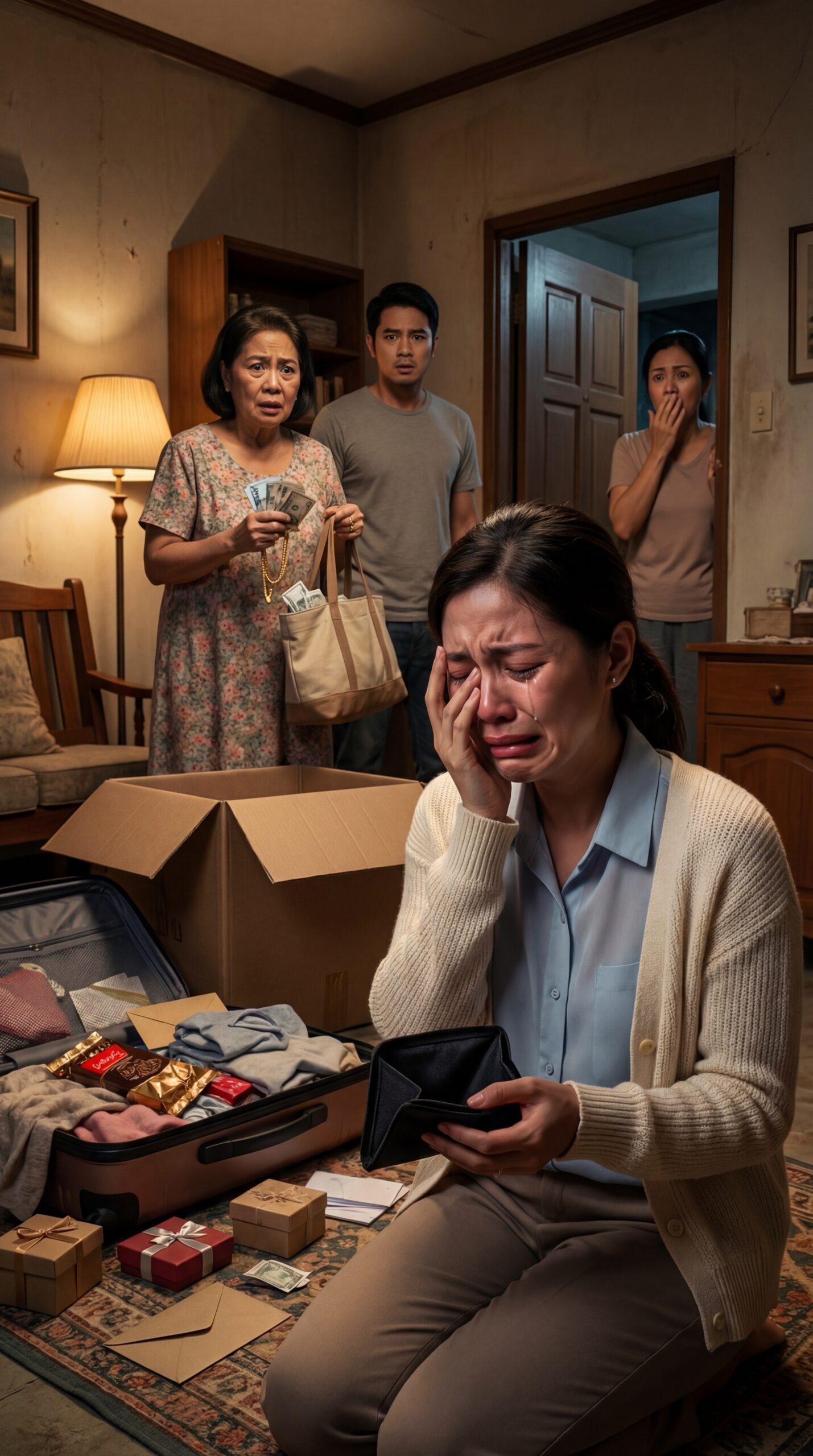 Sa loob ng lumang sala na may ilaw na dilaw mula sa lampshade, may isang tunog na mas matinis pa sa tahimik na kisame—ang paghikbi ng isang babaeng nakaupo sa harap ng bukas na maleta. Nakasubsob ang mukha niya sa palad, namumula ang mata, at sa kabilang kamay, hawak niya ang pitakang nakabukas na parang bibig na nauubos ang salita. Sa sahig, nakakalat ang mga munting kahon ng regalo at ilang sobre, may kartong nakabukas na parang kakasimula lang mag-empake. Ngunit kahit punô ang kwarto ng pasalubong at gamit, may isang bagay na nawawala—at iyon ang dahilan kung bakit nanginginig ang dibdib niya ngayon.