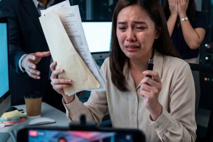 May mga luha na hindi galing sa kabiguan—galing iyon sa kawalan ng katarungan. Sa larawang ito, isang empleyadong nakasuot ng puting polo at ID lace ang nakatayo sa gilid ng conference room, luha ang ...