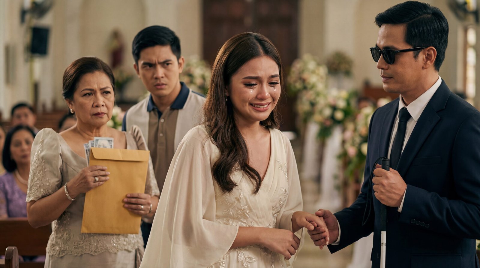 May mga kasalang hindi nagsisimula sa “I do,” kundi sa isang kasinungalingang matagal nang nakapulupot sa lalamunan. Sa loob ng simbahan na amoy bulaklak at kandila, nakasuot ng puti ang dalaga—maganda, kumikinang sa liwanag—pero ang mata niya, basang-basa, at ang ngiti, pilit na pilit. Hawak ng lalaking naka-itim na suit ang kamay niya, suot ang sunglasses na hindi bumababa, at may puting tungkod na nakasandal sa kanya na parang patunay sa lahat na siya’y bulag. Sa likod nila, isang matandang babae ang nakatayo, hawak ang makapal na sobre na may perang sumisilip, at isang binatang lalaki ang nakakunot ang noo, parang gustong sumabog. Sa mismong araw na dapat sagrado, may pera sa sobre, may galit sa mata, at may luha sa babaeng hindi sigurado kung ang pinasok niya ay pag-ibig o kaparusahan.