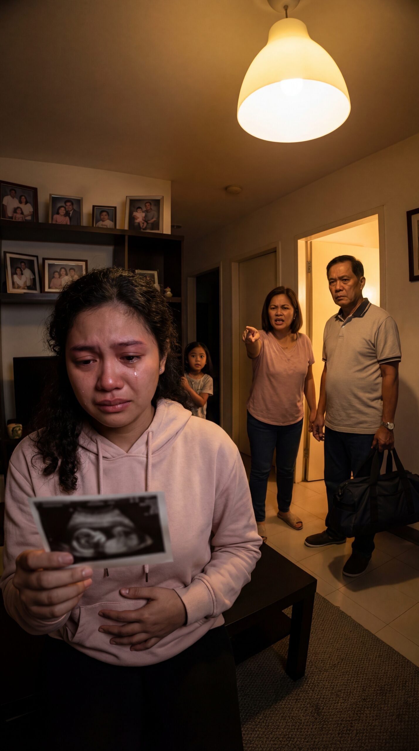 Sa ilalim ng malambot ngunit nakakasakal na ilaw ng kisame, sa loob ng sala na punô ng framed family photos na parang mga matang nakabantay, nanginginig ang kamay ng isang dalaga habang hawak niya ang isang ultrasound picture. Sa bawat patak ng luha na dumudulas sa pisngi niya, mas lalong bumibigat ang papel na iyon—hindi dahil makapal, kundi dahil sa katotohanang dala nito. Nakasuot siya ng simpleng pink na hoodie, isang kamay nakahawak sa tiyan na para bang doon niya kinakapitan ang huling piraso ng tapang niya. Sa likod niya, sa bungad ng hallway, nakatayo ang kanyang ina na nakaturo sa direksyon ng pinto, galit na galit ang mukha, at sa tabi nito ang ama niyang matigas ang tindig, hawak ang isang duffel bag na parang handa nang tapusin ang lahat. May bata pang nakasilip sa likod—takot ang mata, tahimik, parang hindi alam kung iiyak ba o magtatago.