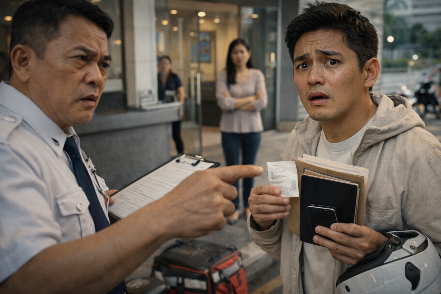 Umaga pa lang, pero pawis na ang likod ni Jomar habang nakatigil ang motor niya sa tapat ng glass doors ng isang malaking building—yung klase ng lobby na may malamig na ilaw at tahimik na hangin, na parang bawal magkamali. Sa isang kamay, hawak niya ang helmet; sa kabila, nakasipit ang folder ng mga dokumento, isang resibo, at cellphone na handa niyang ipakita kahit kanino. Pero sa isang kisapmata, imbes na “delivery,” ang itinatak sa kanya ay “peke”—dahil sa harap niya, isang guard ang nakaturo nang diretso sa mukha niya, may clipboard sa kamay, at may boses na hindi humihingi ng paliwanag kundi nag-aakyat na ng kaso. “Ikaw ‘to. Namemeke ka ng resibo.”
