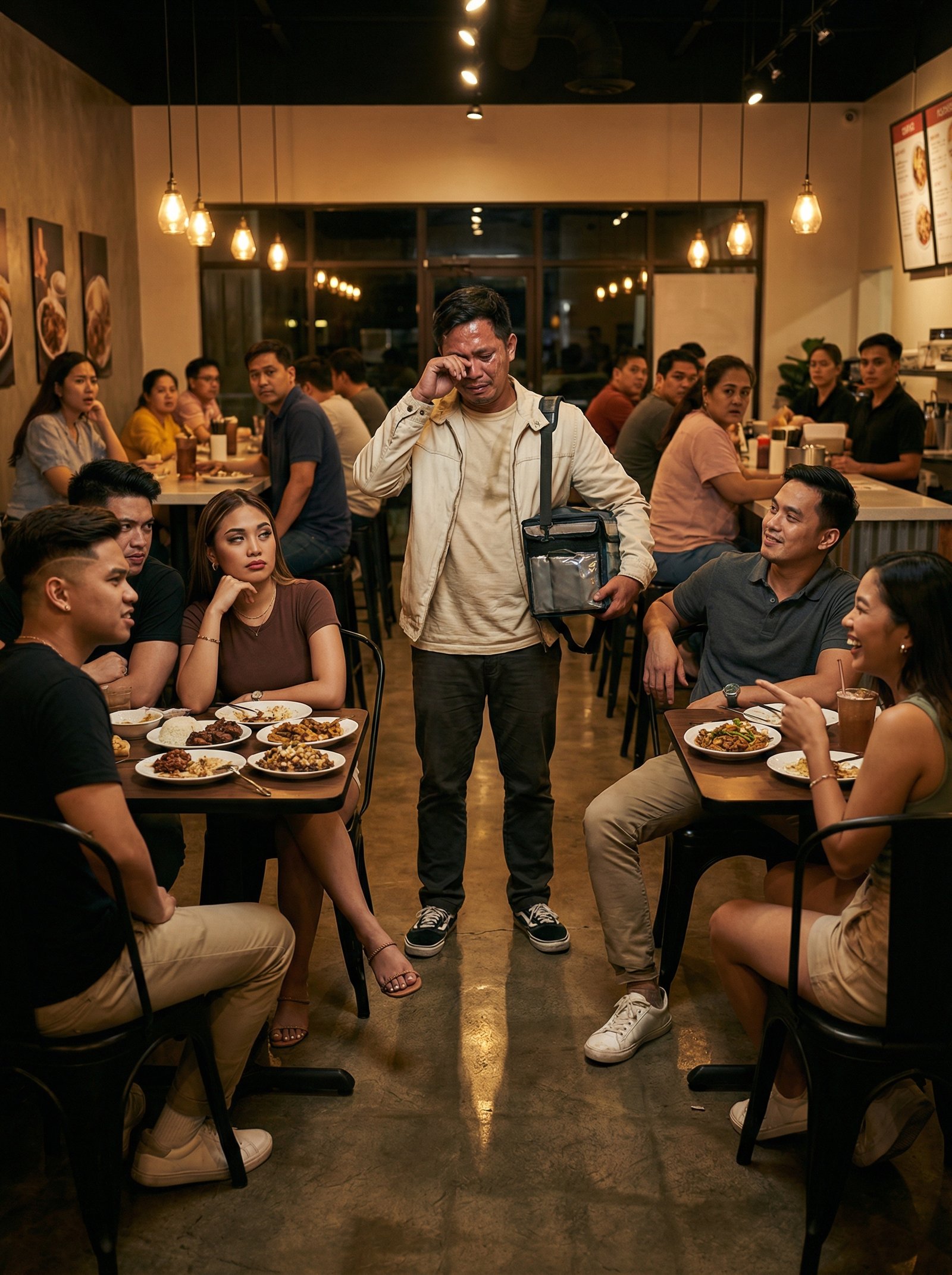 Sa loob ng restaurant na puno ng maiinit na ilaw, maingay na usapan, at amoy ng bagong lutong pagkain, isang eksena ang biglang naging sentro ng lahat ng mata. Sa gitna ng makinis na sahig, sa pagitan ng dalawang mesa na puno ng pagkain at matatapang na tingin, nakatayo ang isang delivery rider na halatang ubos na. Gusot ang jacket niya. May itim na delivery bag na nakasabit sa balikat. Basa ang gilid ng manggas niya sa pawis at alikabok ng maghapong biyahe. Nakayuko siya nang bahagya, at ang isang kamay niya ay nasa mata, pilit pinapahid ang luha na ayaw sana niyang ipakita sa kahit kanino. Pero huli na. Nakita na ng lahat. At ang pinakamasakit, hindi awa ang unang ibinigay sa kanya ng grupong nasa harap niya. Kundi tawa.