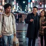 Sa likod niya, may dalawang babae na nakaitim na damit, parehong nakaturo palabas na parang nag-uutos sa isang tauhan. Sa pagitan nila, may guwardiya—naka-uniporme, tahimik, pero malinaw ang presensya: “Lumabas ka.” Sa itaas, may CCTV camera na nakatutok sa entrance, parang sinisiguradong kahit ang pag-alis niya, may rekord. Sa paligid, may patak ng ulan, may dilim ng gabi, at may pakiramdam na ang mundo ay sarado para sa kanya.