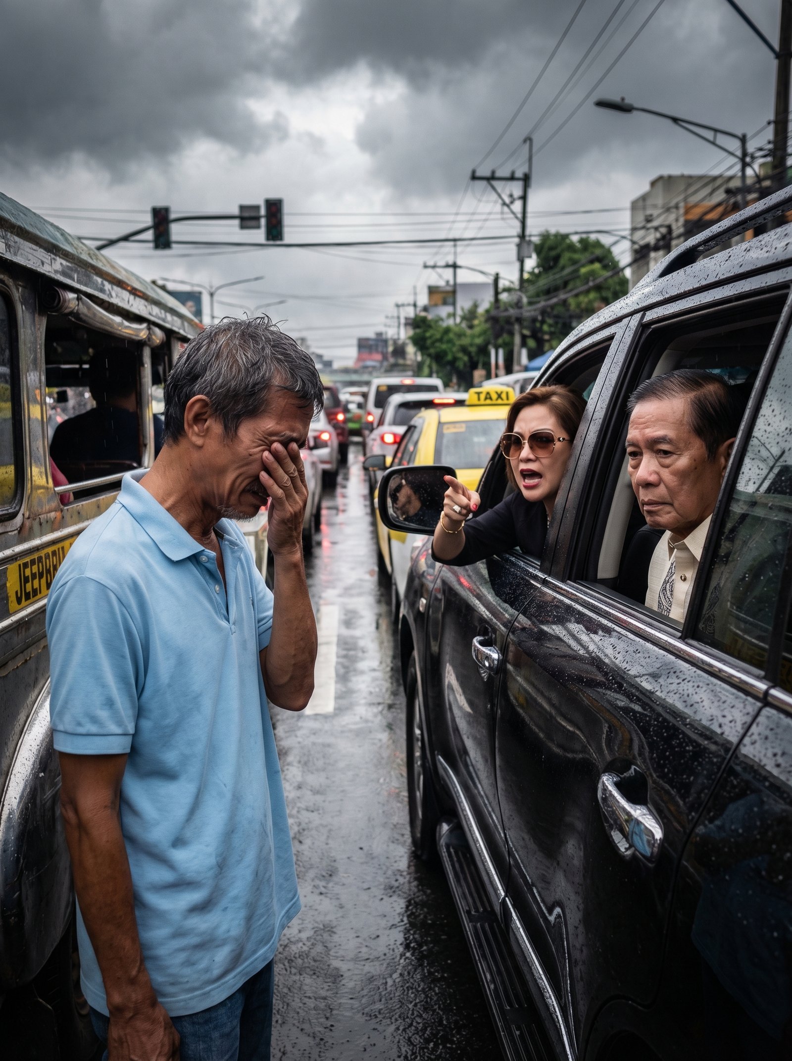 Nakatigil ang trapiko sa ilalim ng pulang ilaw. Makintab ang kalsada sa ulan. Mabagal ang usad ng mga sasakyan. Sa kaliwa niya, ang luma niyang jeep na may kupas nang pintura. Sa kanan, ang itim na SUV na kumikislap kahit basang-basa ng ulan. Sa likod, may taxi at mahabang pila ng mga sasakyang hindi makasingit, hindi makaabante, at hindi makaiwas sa eksenang unti-unting lumalaki.