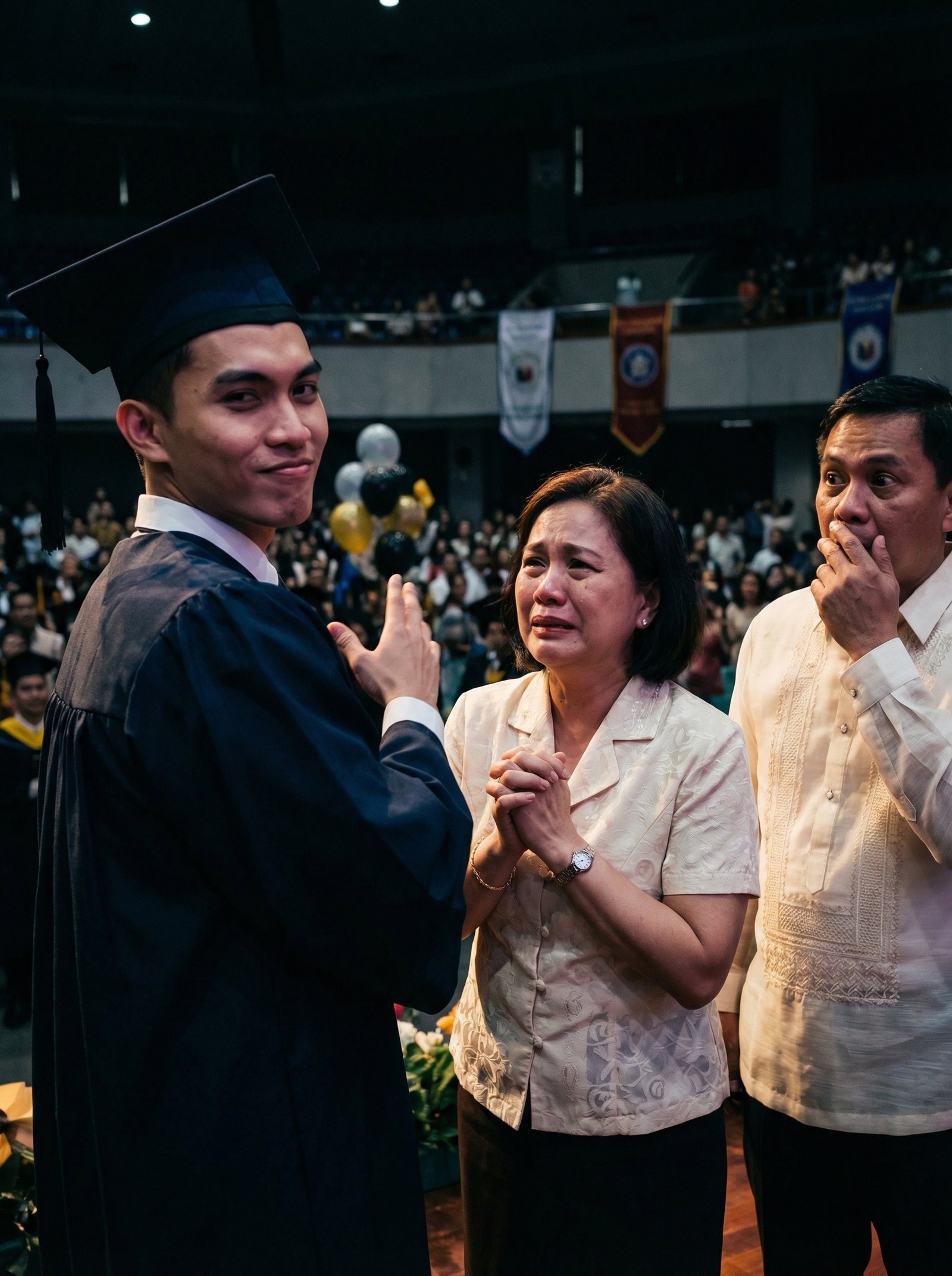Basag na ang boses ng ina niya sa paghikbi. Magkahawak pa rin ang mga kamay nito sa harap ng dibdib, parang bawat salitang lumalabas sa bibig ng anak ay hinihintay niya nang maraming taon. Ang ama niya, nananatiling takip ang kamay sa bibig, pero ang mga mata nito ay kumikislap na sa luhang pilit niyang pinipigil. Sa ilalim ng entablado, nakita ng ilan sa mga guro na ang smirk ni Adrian kanina ay hindi pala pangmamaliit. Iyon pala ang anyo ng isang taong pinipigilang hindi manginig bago durugin ang sarili niyang maskara sa harap ng lahat.