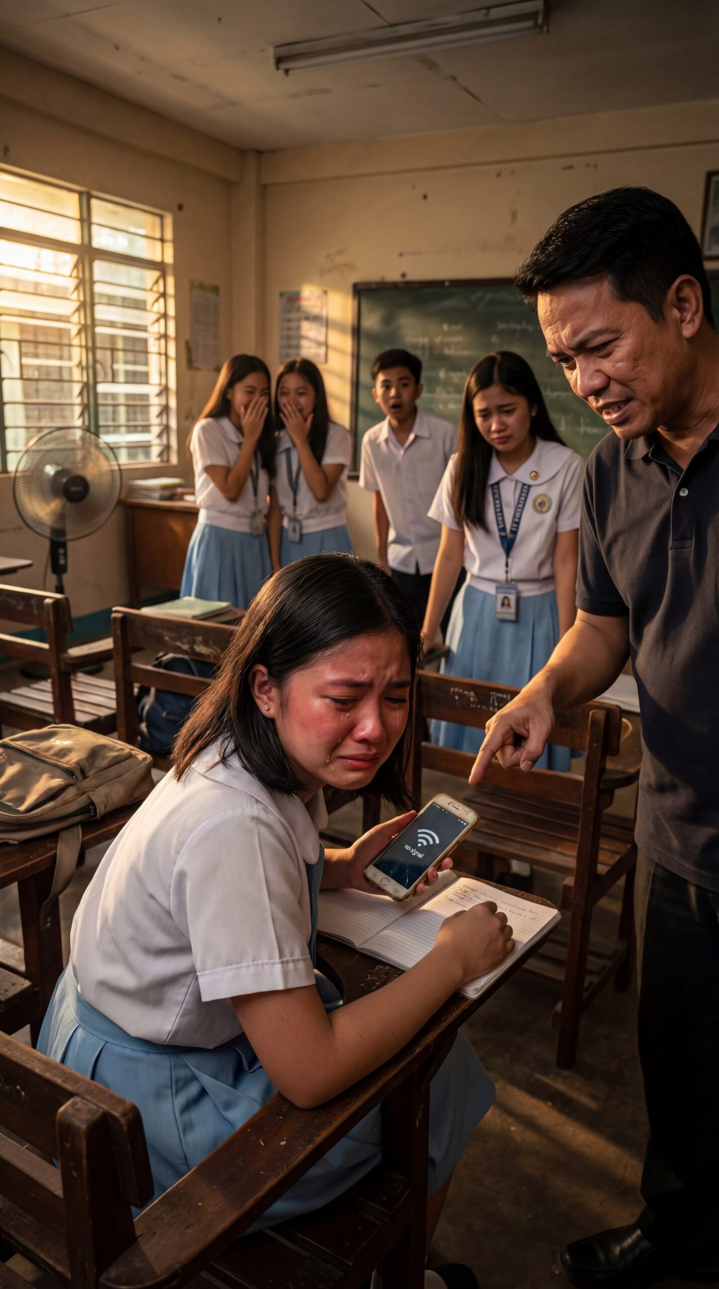 Sa gitna ng lumang silid-aralan na amoy alikabok at chalk, sa ilalim ng dilaw na sikat ng araw na tumatagos sa jalousie na bintana, may isang estudyanteng nakaupo sa kahoy na armchair—yakap ang notebook, nanginginig ang balikat, at basang-basa ang pisngi. Hawak niya ang cellphone na nakatapat sa mesa, at sa screen, malinaw ang nakasulat: walang internet. Sa harap niya, isang guro ang nakatayo, nakakunot ang noo, at nakaturo ang daliri na parang kutsilyo ang bawat salita. Sa likod, may dalawang kaklase na nakatakip ang bibig sa gulat, may isang lalaki na nakabukas ang bibig, at may isang babae na nakayuko na parang nahihiya para sa kanya. Sa gilid ng silid, may lumang electric fan na nakatigil, at sa pisara, may mga sulat na hindi na mabasa nang buo—parang ang mismong classroom ay pagod na rin sa paulit-ulit na kwento ng kahihiyan.