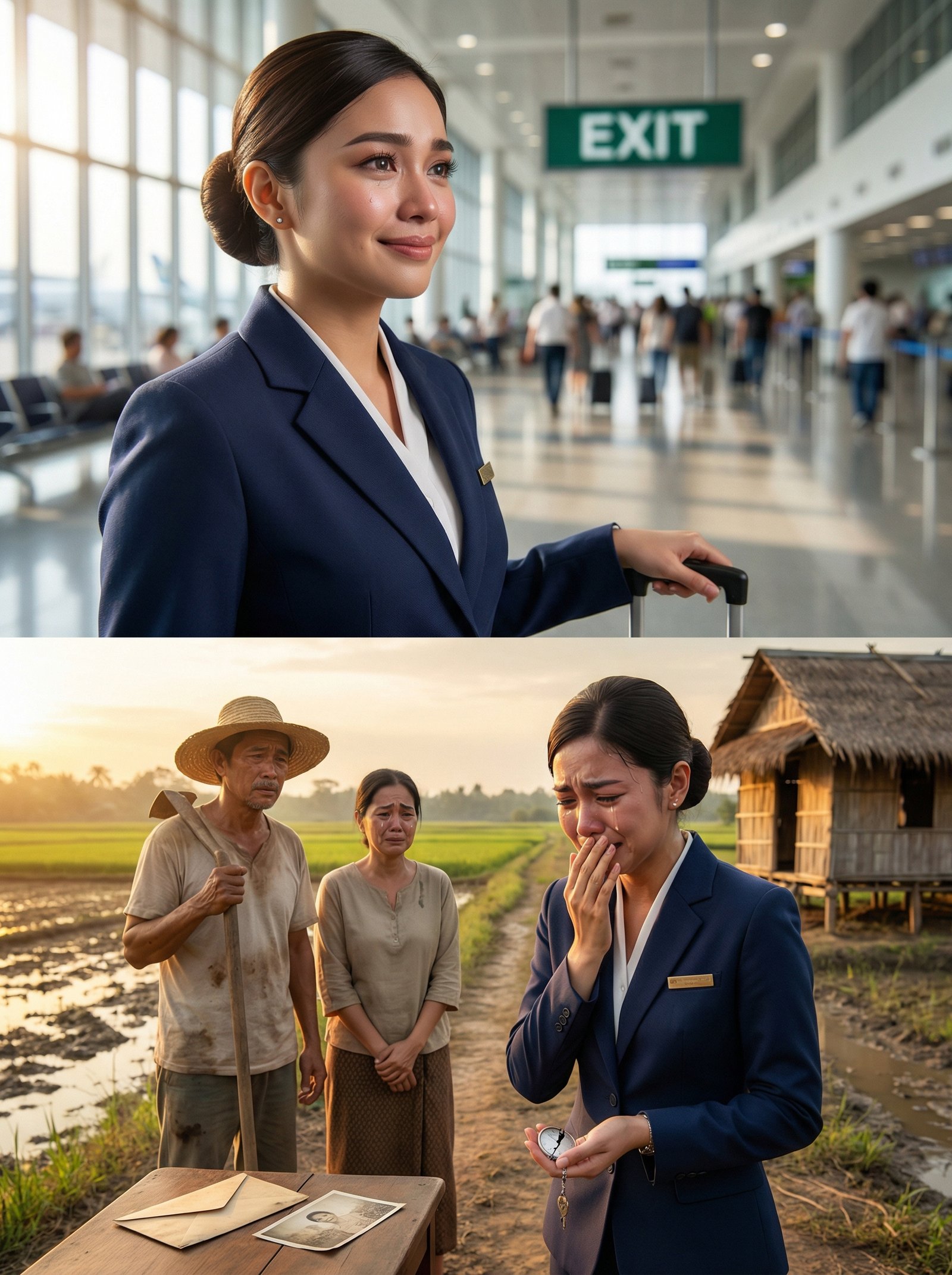 Sa ikalawang larawan ng buhay niya, hindi na siya flight attendant sa airport. Isa na siyang anak sa gitna ng palayan—naka-blazer pa rin, pero ang puso niya, hubad. Nakita niya ang mga kamay ni Nanay Cora na nanginginig, ang mata ni Tatay Simo na parang pinipigilan ang luha, at ang tahimik na pagtingin ng mga kapitbahay na parang may alam na hindi nila masabi.