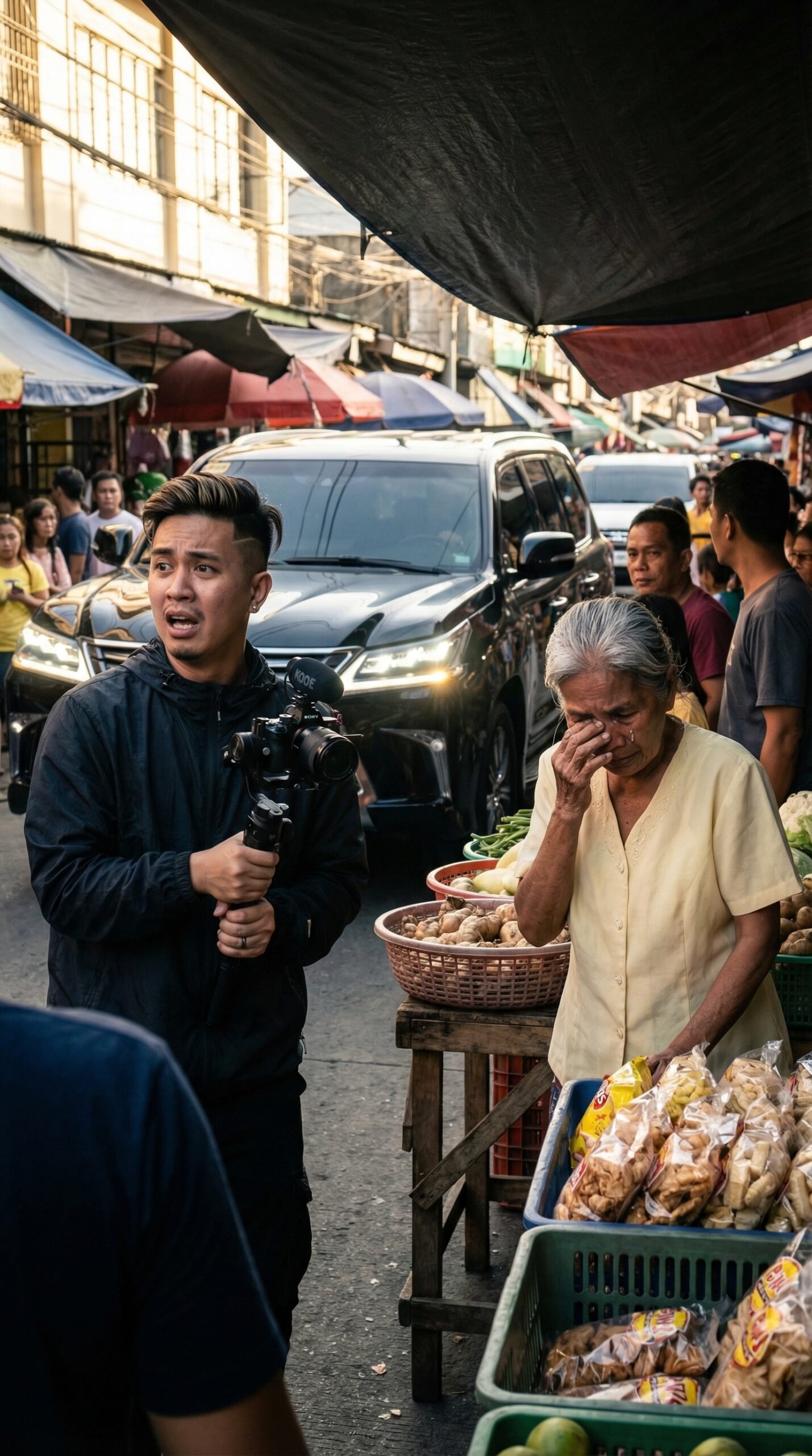 Hindi agad umiyak ang matandang tindera. Iyon ang unang nakabasag sa damdamin ng ilang taong nanonood. Tahimik lang siya sa likod ng maliit niyang puwesto, sa ilalim ng magkakapatong na trapal na nangingitim na sa alikabok at usok ng kalsada. Sa harap niya ay mga basket ng sibuyas, luya, at ilang gulay na hindi na kasing sariwa ng umaga. Sa gilid ay may mga plastik na supot ng chichirya at kropek na nakasabit at ang iba ay nakasalansan sa berdeng lalagyan. Sa gitna ng makipot na daan ng palengke, sa pagitan ng maiingay na mamimili at ng mabibigat na sasakyang sumisingit, nakatayo si Jio Villareal, sikat na vlogger na kilala sa “real talk” content at mapanuyang biro na gustong-gusto ng followers niya.