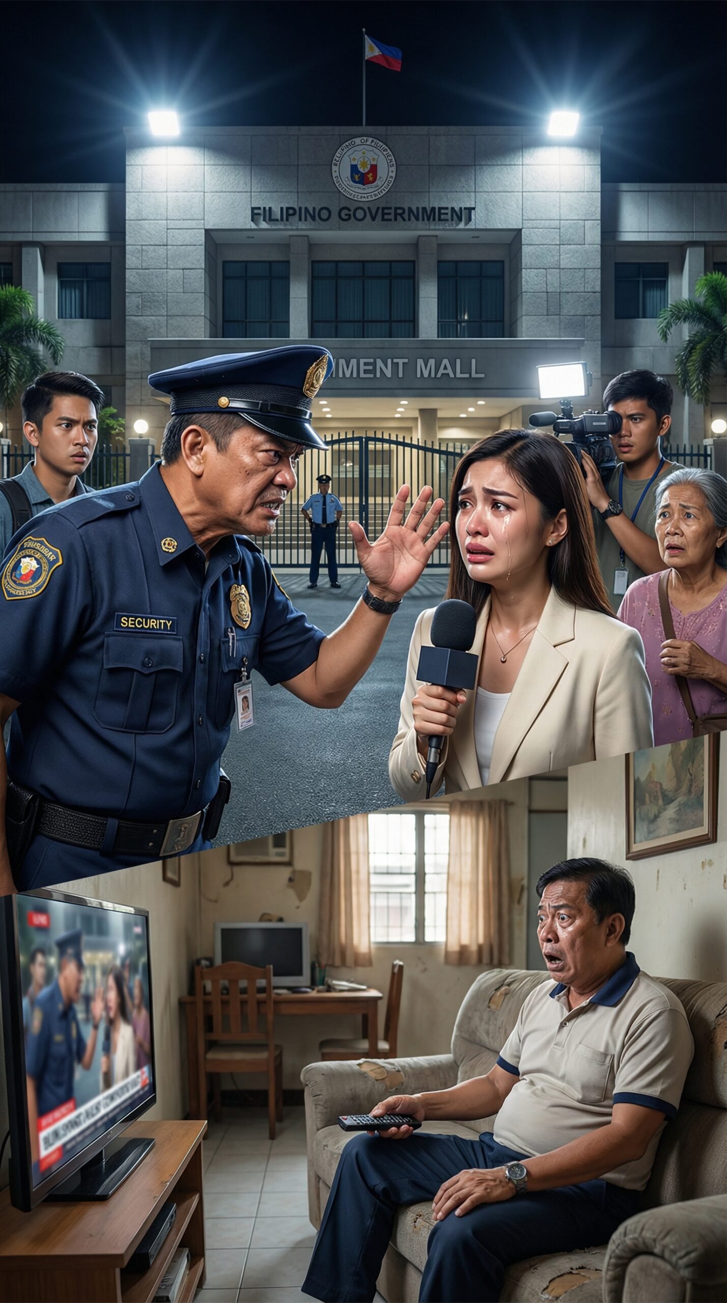 May mga sandaling isang sigaw lang ang pagitan ng “trabaho lang” at “pang-aabuso.” At minsan, ang isang segundo sa harap ng camera ang kayang bumura sa reputasyon mong ilang taon mong binuo. Sa malamig na gabi sa tapat ng isang gusaling bato na may malaking nakasulat na FILIPINO GOVERNMENT at bandilang humahampas sa hangin, kumikislap ang mga floodlight na parang mata ng batas—maliwanag, matalim, at walang pinapalampas. Sa harap ng gate, may isang security guard na naka-uniporme, nanginginig ang panga sa galit, nakataas ang kamay na tila babagsak anumang oras. Sa tapat niya, isang batang reporter ang nakahawak sa mikropono, luha ang tumatakbo sa pisngi, pilit humihinga habang pinipigilan ang sarili na gumuho sa harap ng live camera.