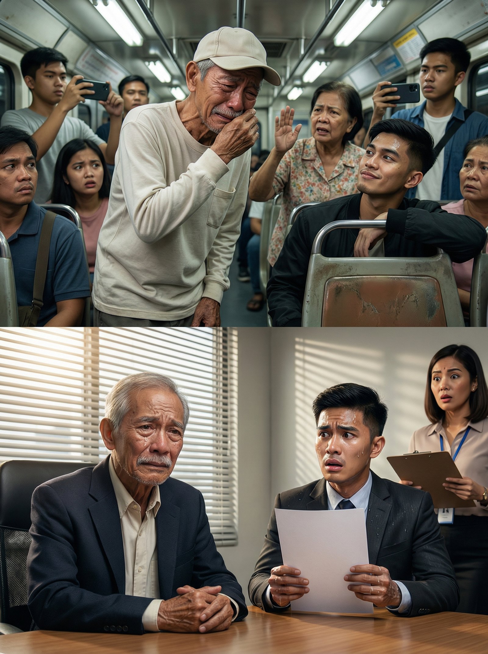 Sa loob ng isang masikip na tren na kumakalog sa bawat liko, may isang matandang lalaki na nakatayo—luha ang tumutulo, nanginginig ang labi, at ang kamay niya’y nakatakip sa bibig para hindi marinig ang hikbi. Sa tapat niya, isang binatang naka-black jacket ang nakaupo sa upuang dapat sana’y para sa kanya, nakasandal pa sa sandalan na parang walang nangyayari. Sa paligid, may mga pasaherong gulat, may mga nakasimangot, may isang nanay na nakataas ang kamay na parang umaawat, at may mga cellphone na nakataas para i-video ang kahihiyan. Kung titingnan mo, parang simpleng away-upuan lang sa tren. Pero ang tanong ay isa lang: paano kung ang matandang pinaiyak nila… ay siya palang taong hahawak ng kinabukasan ng binatang ‘yon pagdating sa opisina?