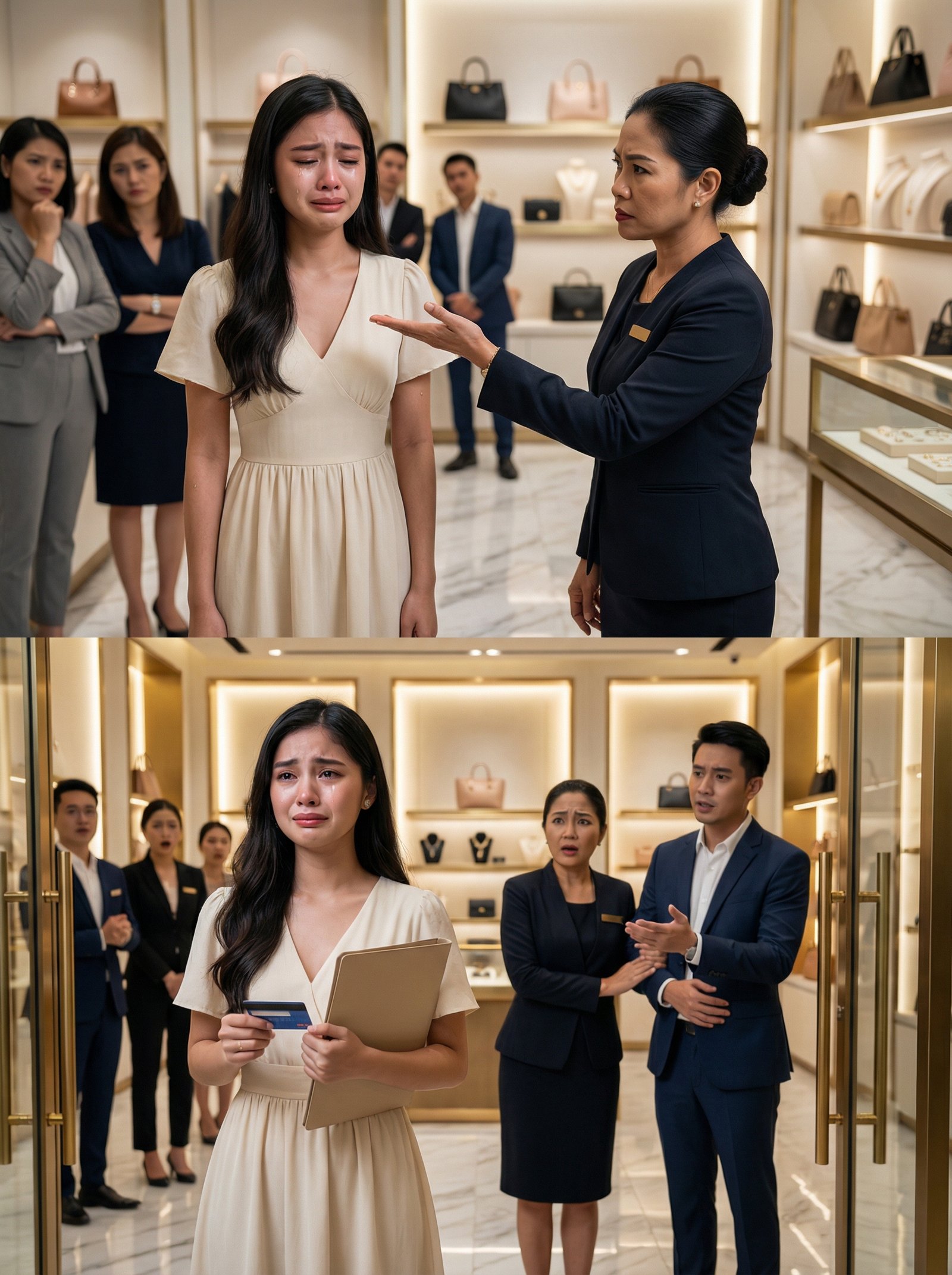 Sa loob ng isang luxury store na amoy bagong leather at mamahaling pabango, may isang dalagang nakasuot ng simpleng cream dress na umiiyak habang nakapako ang mata sa sahig. Sa harap niya, isang sales manager na naka-itim na suit ang nakataas ang palad at nakaturo na parang naglalabas ng hatol. Sa paligid, may mga staff na nakapamewang, may mga matang nagbubulungan, at may mga bag sa display na kumikislap sa ilaw—parang sinasadyang ipaalala kung sino lang daw ang “bagay” dito. Kung titingnan mo, parang ordinaryong pagpapahiya lang sa isang customer na “hindi mukhang may pera.” Pero ang tanong ay isa lang: paano kung ang pinapaalis nila… ay siya palang may kakayahang bilhin ang lugar na ‘yon, at baguhin ang kapalaran ng lahat ng nandito?