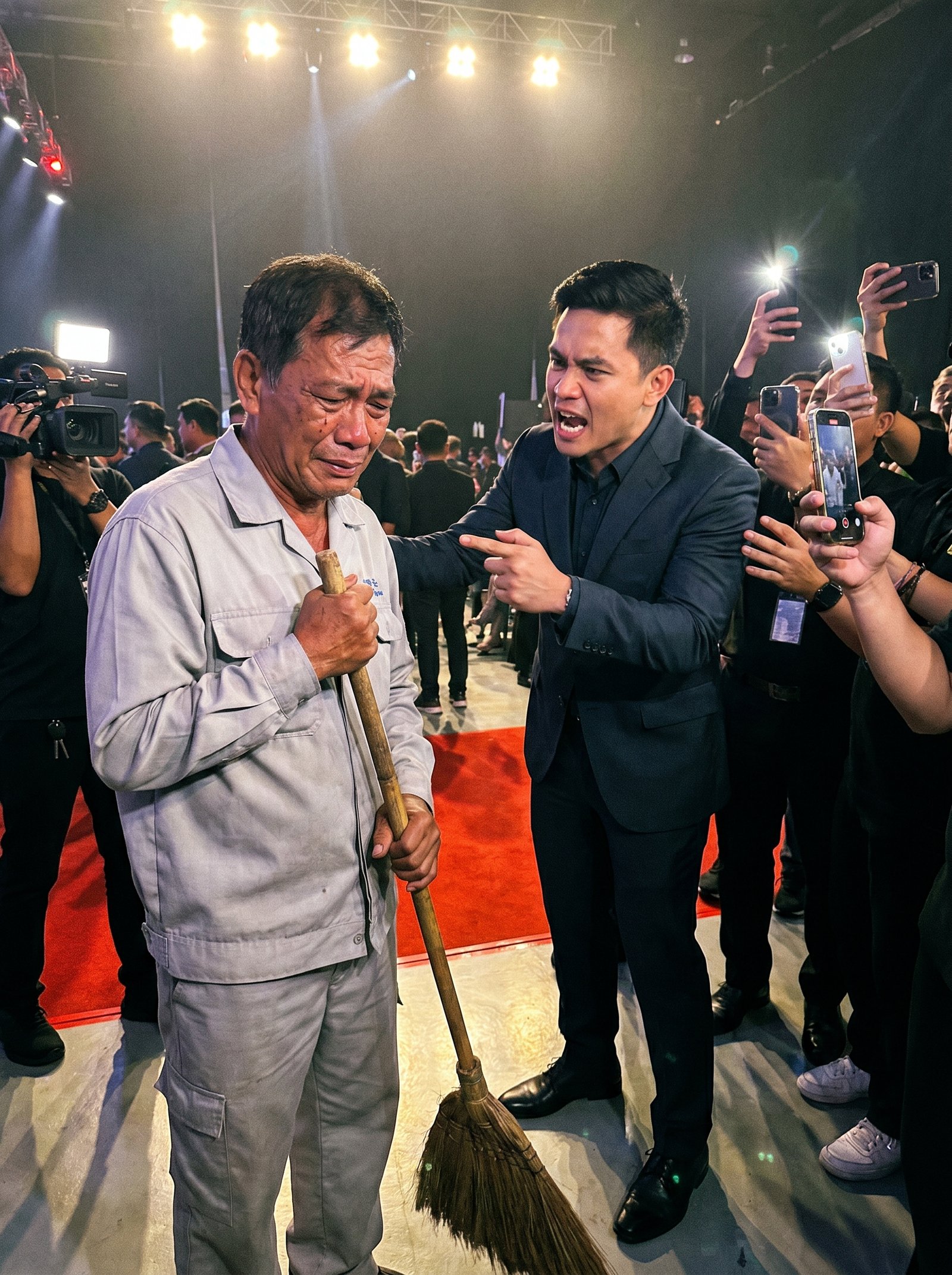 Hindi na niya maalala kung paano nagsimula ang sigawan. Ang alam lang ni Mang Ben, kanina pa siya tahimik na nagwawalis sa gilid ng pulang karpeta habang ang buong paligid ay nilalamon ng ilaw, kamera, at sigawan ng mga tao. Sa loob ng malaking event hall, naglalakihan ang spotlight sa kisame, kumikislap ang mga lente ng media, at halos lahat ng naroon ay may hawak na cellphone, nakatutok sa bawat galaw ng mga artistang dumarating. Sa ganitong mga gabi, hindi naman talaga dapat nakikita ang mga tulad niya. Trabaho niyang gawing malinis ang sahig, pero manatiling parang hangin—nariyan, pero walang pumapansin.