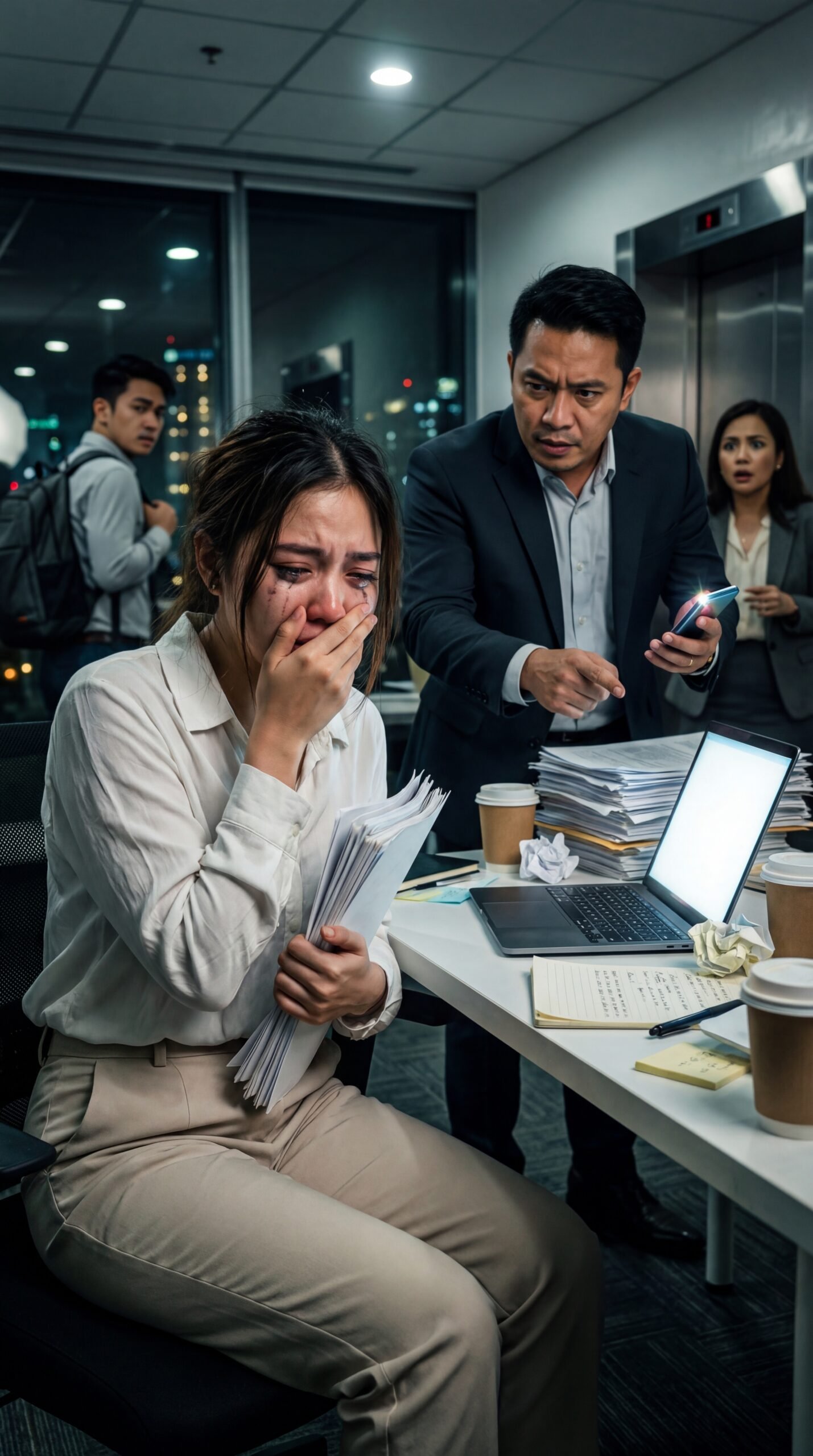 Sa gitna ng malamig na ilaw ng opisina na halos gabi na kung kumilos ang oras, may isang intern na nakaupo sa upuang umiingit sa pagod—yakap-yakap ang makapal na bundle ng papeles na parang doon na lang siya kumakapit para hindi tuluyang gumuho. Basa ang pisngi niya, nangingitim ang mascara sa ilalim ng mata, at ang palad niyang nakatakip sa bibig ay halos hindi na makapigil sa hikbi. Sa harap niya, isang manager na naka-suit ang nakatayo, nakakunot ang noo, at nakaturo ang daliri habang hawak ang cellphone na nakailaw pa, parang flashlight na ginagawang spotlight ng kahihiyan. Sa mesa, bukas ang laptop, may mga crumpled na papel, sticky notes, at tatlong basong kape na malamig na—mga saksi sa overtime na walang katapusan. Sa likod, bukas ang pinto ng elevator, at may dalawang empleyadong nanlaki ang mata: isang lalaki na may backpack na napalingon na lang, at isang babaeng halos mapatakip sa bibig sa gulat.