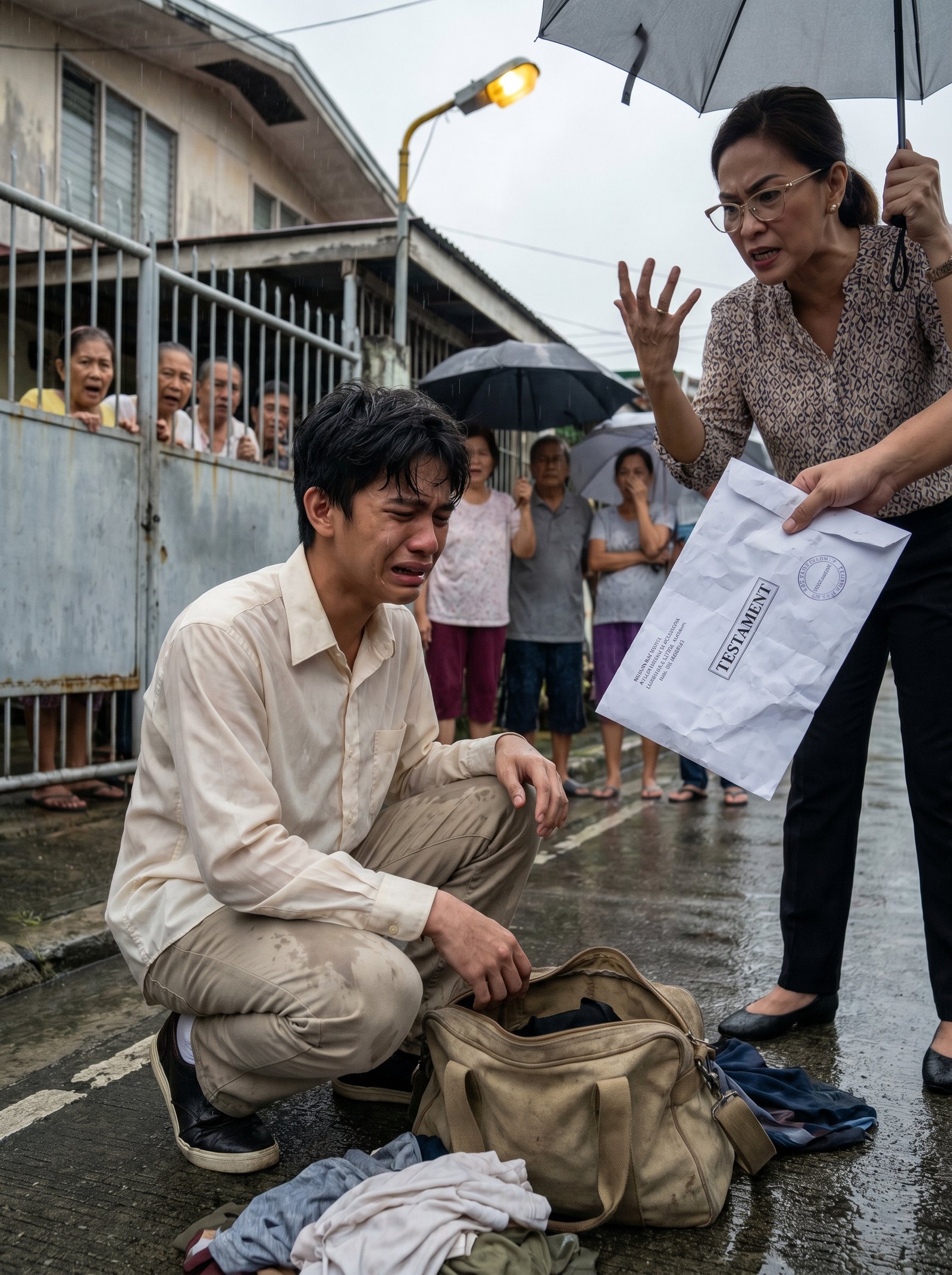 Pero nang araw na iyon, wala nang pagtatago si Leonila. Basang-basa ang buhok ni Marco, nangingitim ang langit sa ulap, at sa ilalim ng maputlang ilaw ng poste, lalong lumabas ang tigas ng mukha ng tiyahin niya. Sa isang kamay, hawak nito ang puting sobre na gusot na sa higpit ng pagkakahawak. Malinaw ang nakasulat sa harap—TESTAMENT. At parang lalo siyang nasusuka sa takot habang nakatitig doon.