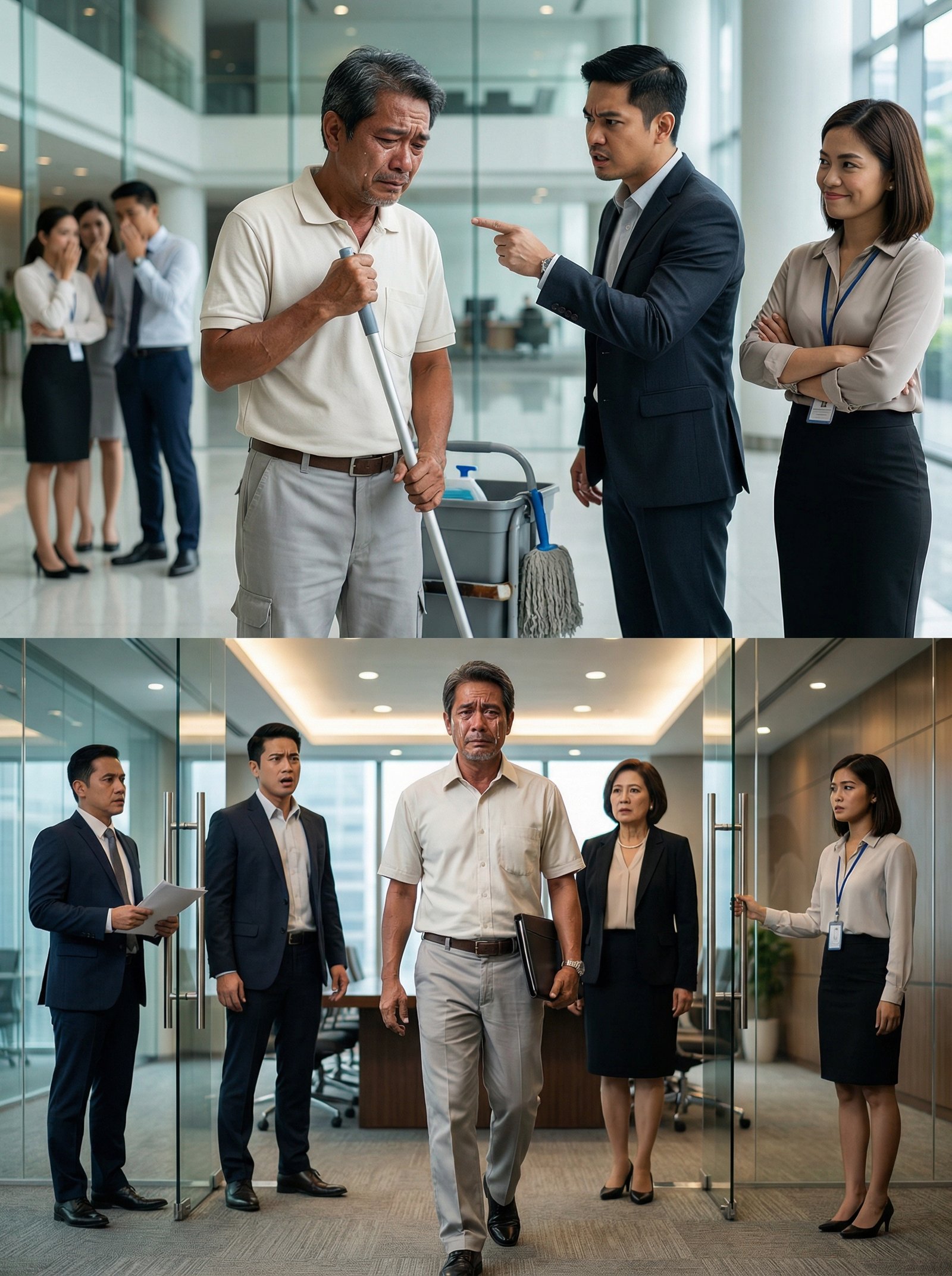 Sa loob ng isang salaming lobby na malamig ang hangin at mas malamig ang tingin ng mga tao, may isang janitor na nakayuko habang hawak ang mop—hindi dahil pagod lang, kundi dahil may mga salitang tumama sa kanya na parang basura ring itinapon. Sa harap niya, isang lalaking naka-suit ang nakaturo, galit ang panga at matalim ang boses; sa tabi, isang babaeng naka-ID ang nakangiting mayabang, nakapulupot ang braso na parang nanonood ng palabas. Sa likod, may mga empleyadong nagbubulungan, halatang aliw sa kahihiyan ng iba. Sa unang tingin, isa na namang kwento ng “maliit na tao” na tinapakan sa corporate world. Pero sa araw na iyon, ang mop ang magiging takip ng pinakamalaking lihim—dahil ang janitor na inalipusta… siya pala ang secret investor na magsasalba sa kumpanyang halos malunod.