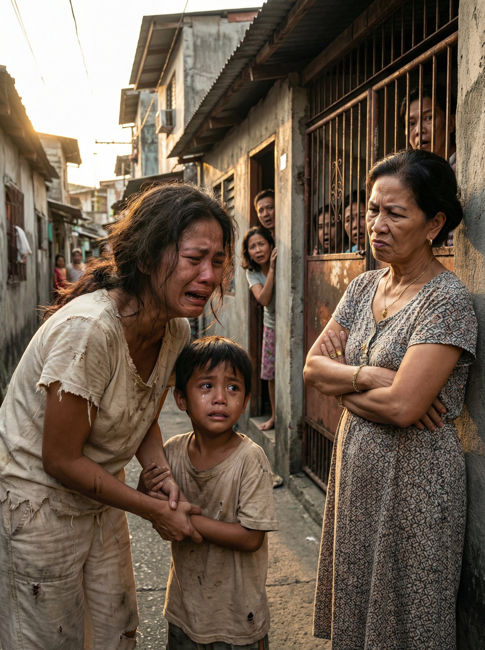 Sa makitid na eskinita na halos magkadikit ang mga dingding at bubong, walang lihim na natatagal. Kapag may umiyak, alam ng buong hanay. Kapag may nag-away, may mga matang sisilip sa bintana, sa siwang ng pinto, sa pagitan ng kalawangin na rehas. At sa hapon na iyon, habang ang araw ay pahilig nang tumatama sa maruruming pader at kupas na semento, muling naging sentro ng tingin ng mga kapitbahay ang mag-inang matagal nang sanay pagtawanan. Ang ina ay nakasuot ng lumang damit na halos mapunit na sa balikat at tuhod, gusot ang buhok, namamaga ang mga mata sa pagod at gutom. Ang batang nasa tabi niya ay marumi ang damit, payat, at takot na takot ang tingin, na para bang kahit ang paghinga ay humihingi muna ng permiso sa mundo. Mahigpit ang hawak ng ina sa kamay ng anak niya, hindi dahil galit siya, kundi dahil iyon na lang ang natitira niyang kayang bantayan.
