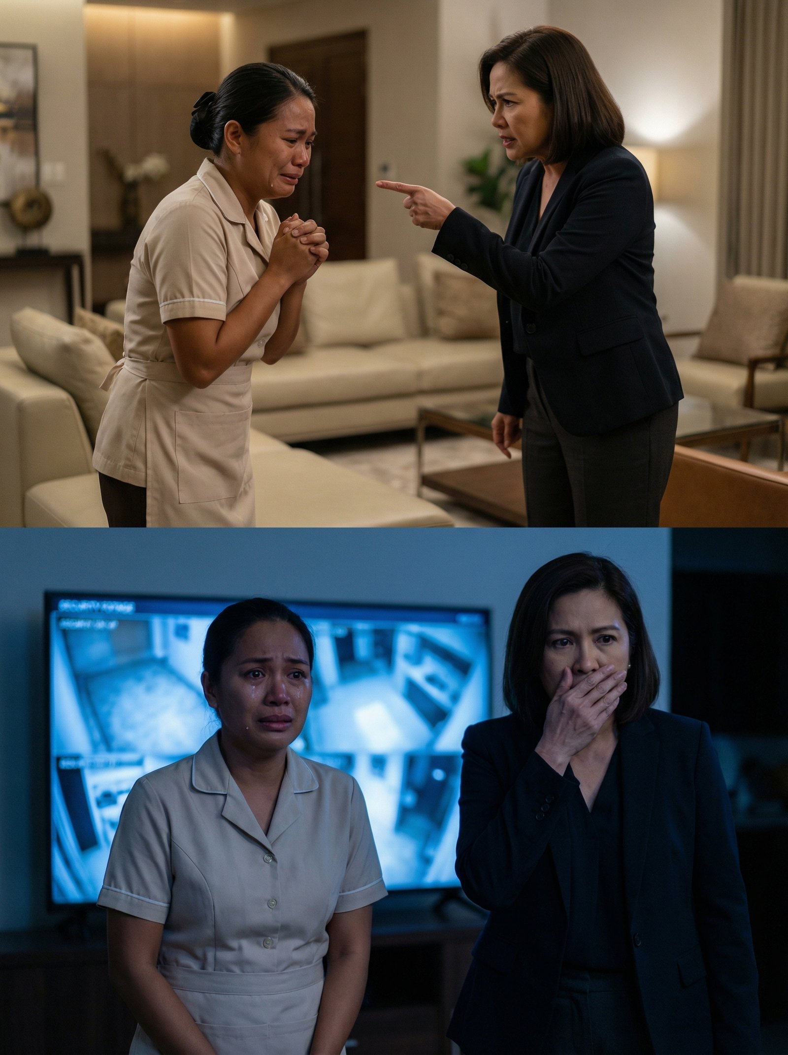 Sa loob ng isang malawak at modernong sala, may malambot na sofa, mamahaling mesa, at ilaw na nagbibigay ng mainit ngunit mabigat na atmosphere, nakatayo ang isang ginang na may suot na itim na blazer. Matigas ang kanyang mukha. Galit ang kanyang mga mata. Sa harap niya ay ang kanilang kasambahay—nakayuko, nanginginig, at halos hindi makatingin.