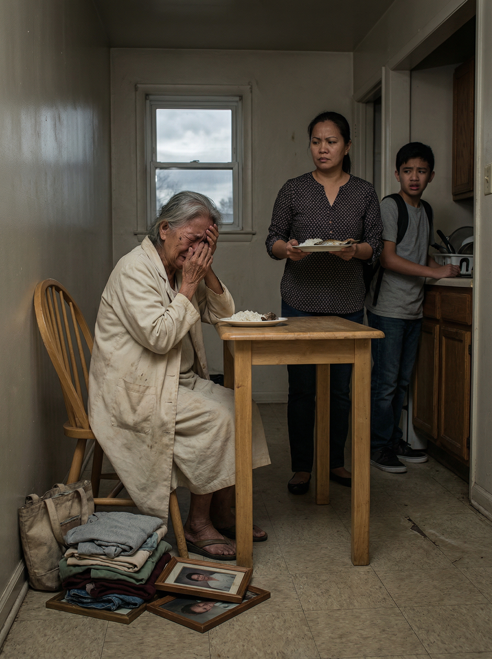 Sa loob ng makipot at malamig na kusina-kainan na halos isang lamesa at ilang hakbang lang ang pagitan sa lababo, doon unti-unting nauubos ang isang inang minsang bumuhay ng buong tahanan. Nakasubsob sa dalawang palad ang matandang si Aling Rosa, nakaupo sa lumang silya, umiiyak nang tahimik sa harap ng pinggang may kanin ngunit halos walang ulam. Sa tabi ng paa niya, nakasalansan sa sahig ang ilang maayos na tinuping damit, lumang bag, at mga retratong basta na lamang ibinaba at itinabi na parang mga bagay na wala nang may gustong alalahanin. Ang mga frame na iyon ang tanging natira sa isang buhay na minsang siya ang sentro. Sa harap niya, nakatayo ang anak niyang si Lani, hawak ang isang plato, matigas ang mukha, malamig ang tingin, at parang bawat salitang lalabas sa bibig ay kayang magtanggal ng huling piraso ng dangal ng sariling ina.