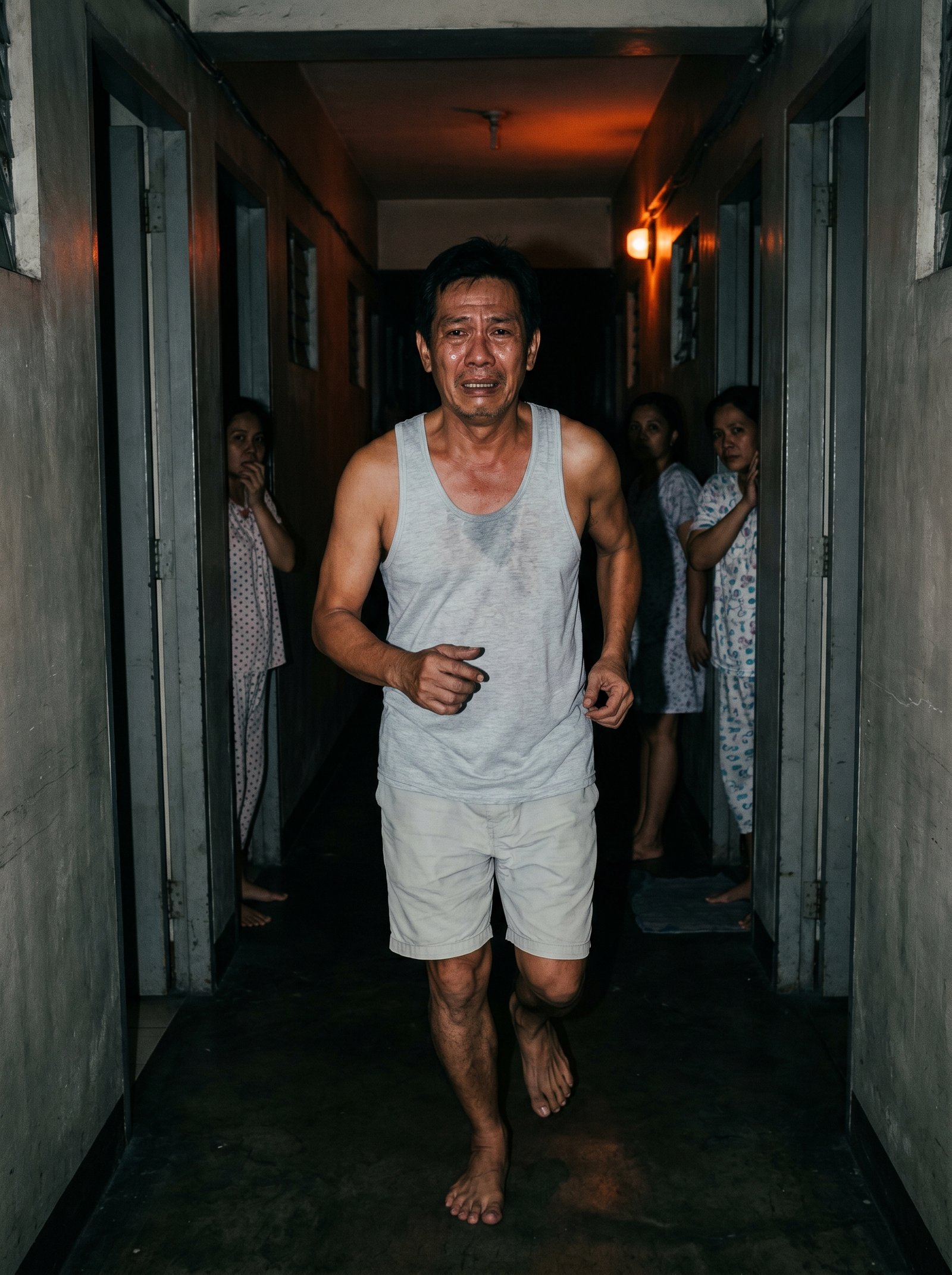 Tumakbo siya pabalik sa hagdan. Sa hallway, nagsisilabasan na ang mga tenant mula sa mga pintuan nila, mga babaeng nakadaster at pajama, halatang puyat, halatang takot, halatang hindi na galit lang ang nararamdaman. Nakatitig sila sa kanya habang siya ang nagmamadaling dumaan sa gitna nila, halos madulas sa sariling pawis.