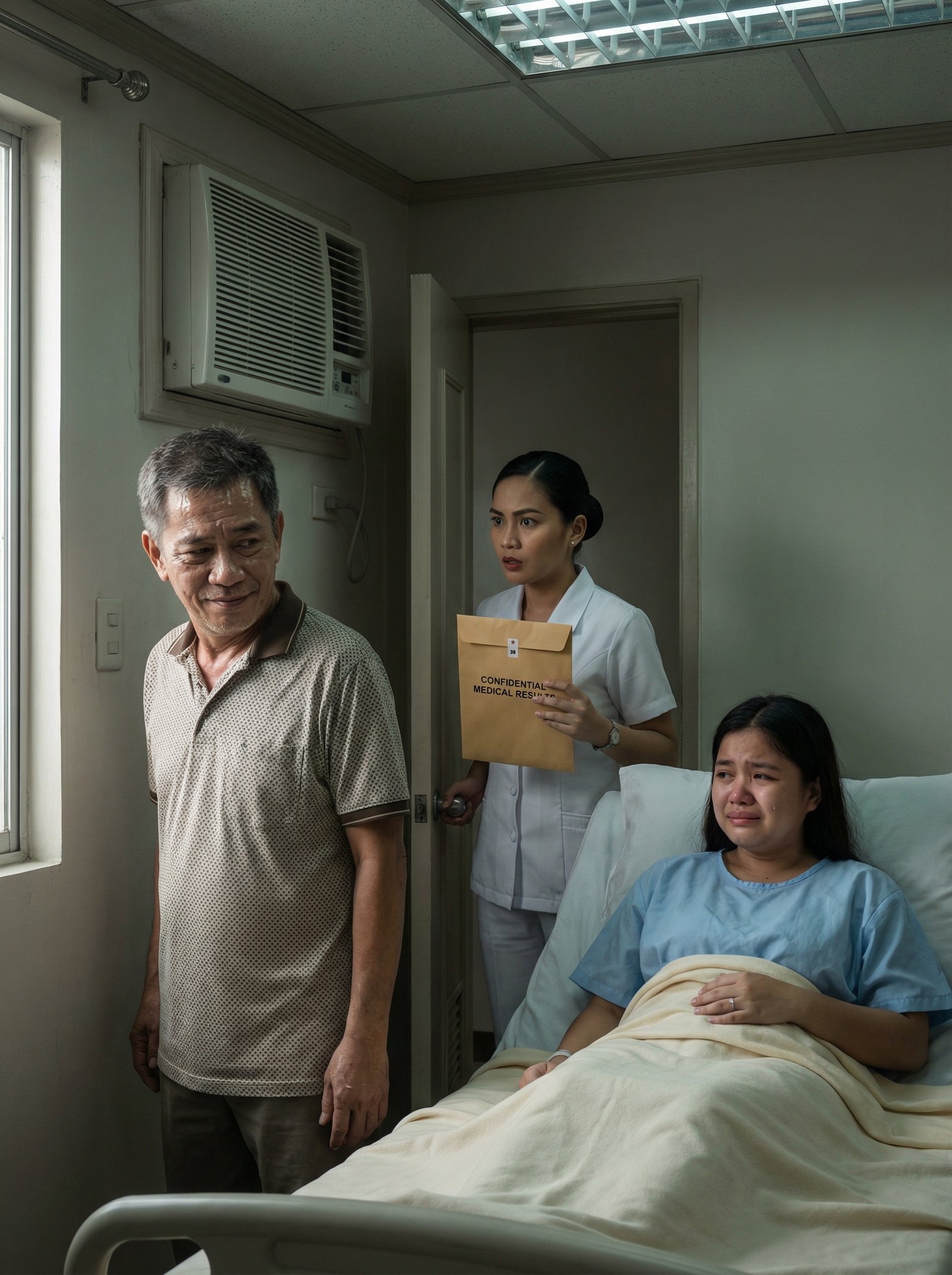 Mabigat ang hangin sa maliit na ospital room. Maputla ang ilaw sa kisame, tahimik ang corridor sa labas, at sa tabi ng bintana ay naroon ang lumang aircon na pilit nagpapalamig sa kwartong punong-puno ng pagod, gamot, at takot. Sa kama, nakahiga si Liza, nakasuot ng asul na hospital gown, balot ng manipis na kumot, nanginginig ang labi habang may luhang tuloy-tuloy na pumapatak sa gilid ng kanyang mukha. Hindi niya halos maitaas ang kamay dahil sa panghihina, pero sapat ang lakas niya para hawakan ang kumot at pigilan ang sarili na tuluyang humagulgol.