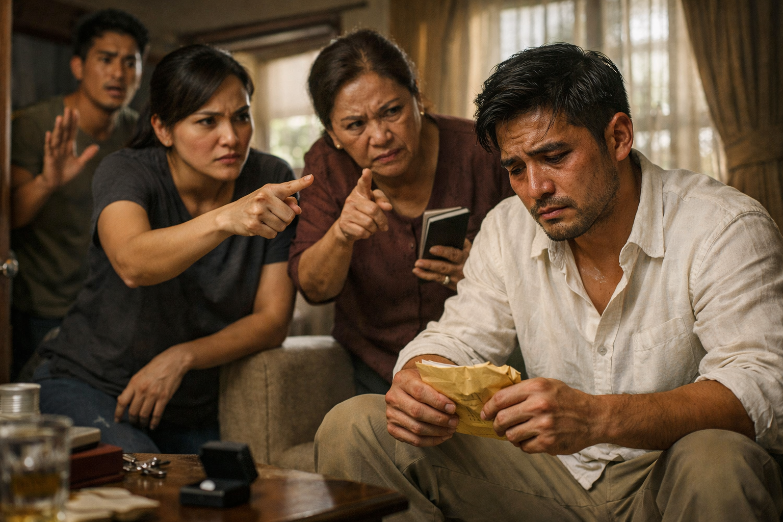 Sa mismong sandaling pumasok sa tenga niya ang salitang “wala kang kwenta,” parang may piraso ng sarili si Ramon na napigtas at nahulog sa sahig—hindi maririnig, pero ramdam. Sa loob ng sala na amoy lumang kurtina at kape na malamig na, nakaupo siya sa gilid ng sofa, pawis ang noo, namumula ang mata, at hawak-hawak ang gusot na sobre na parang huling ebidensya ng dignidad. Sa harap niya, nakaturo ang dalawang daliri—isa mula sa asawa niyang si Kyla, isa mula sa biyenan niyang si Aling Cora—mga daliring hindi lang nagtuturo, kundi humuhusga. Sa likod, may lalaking nakatayo, kamay nakataas na parang pipigil, pero ang mukha’y punô ng kaba, parang alam niyang kapag sumali siya, siya rin ang madadamay.