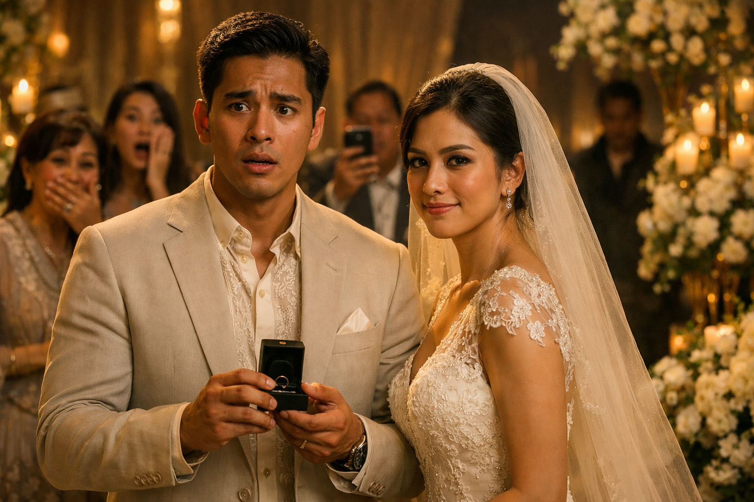 Sa mismong sandaling bumukas ang maliit na kahon ng singsing sa ilalim ng gintong liwanag ng mga kandila, doon nagsimulang lumamig ang palad ni Marco—kahit mainit ang hangin sa loob ng bulwagan. Naka-beige siyang suit, maayos ang tikas, pero ang mukha niya… parang biglang naubusan ng hangin. Nakataas ang kilay, nakabukas ang bibig, at sa mata niyang nanginginig, may tanong na hindi niya masabi. Sa tabi niya, si Liana—nakasuot ng puting gown na may detalye ng bulaklak sa manggas, may belo na dumadaloy sa balikat, at may ngiting parang alam na ang mangyayari—nakaharap sa mga bisita na tila nanonood ng isang eksenang hindi nakasulat sa programa.